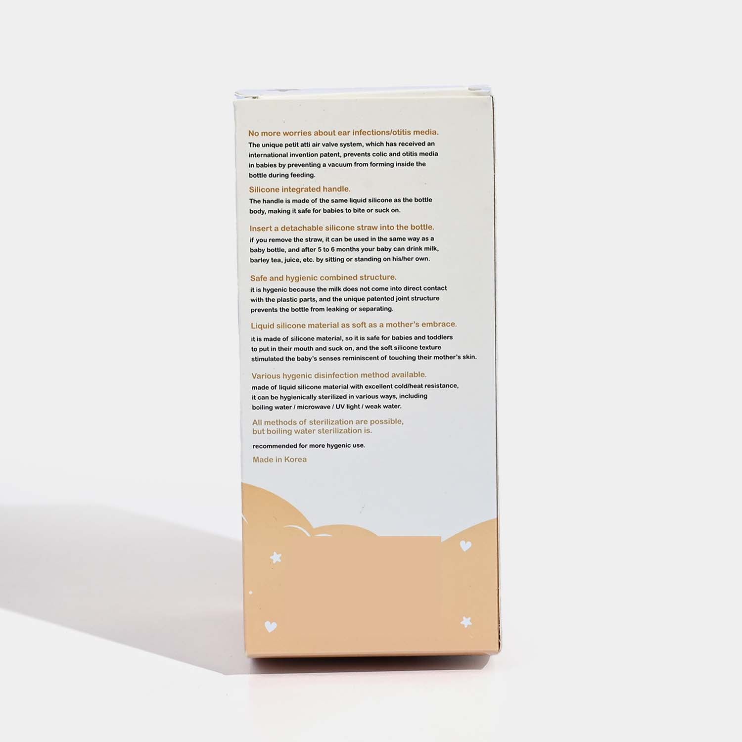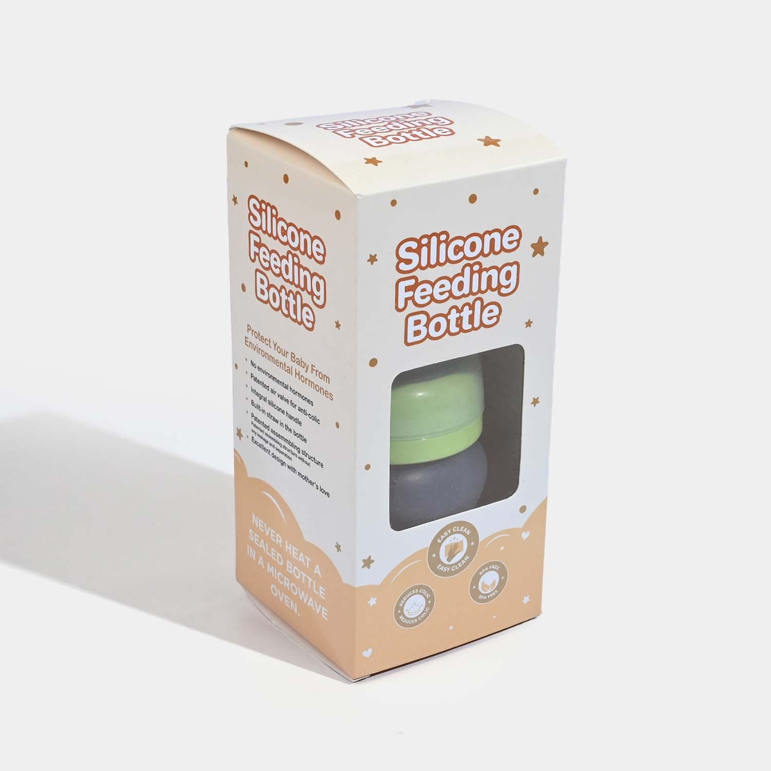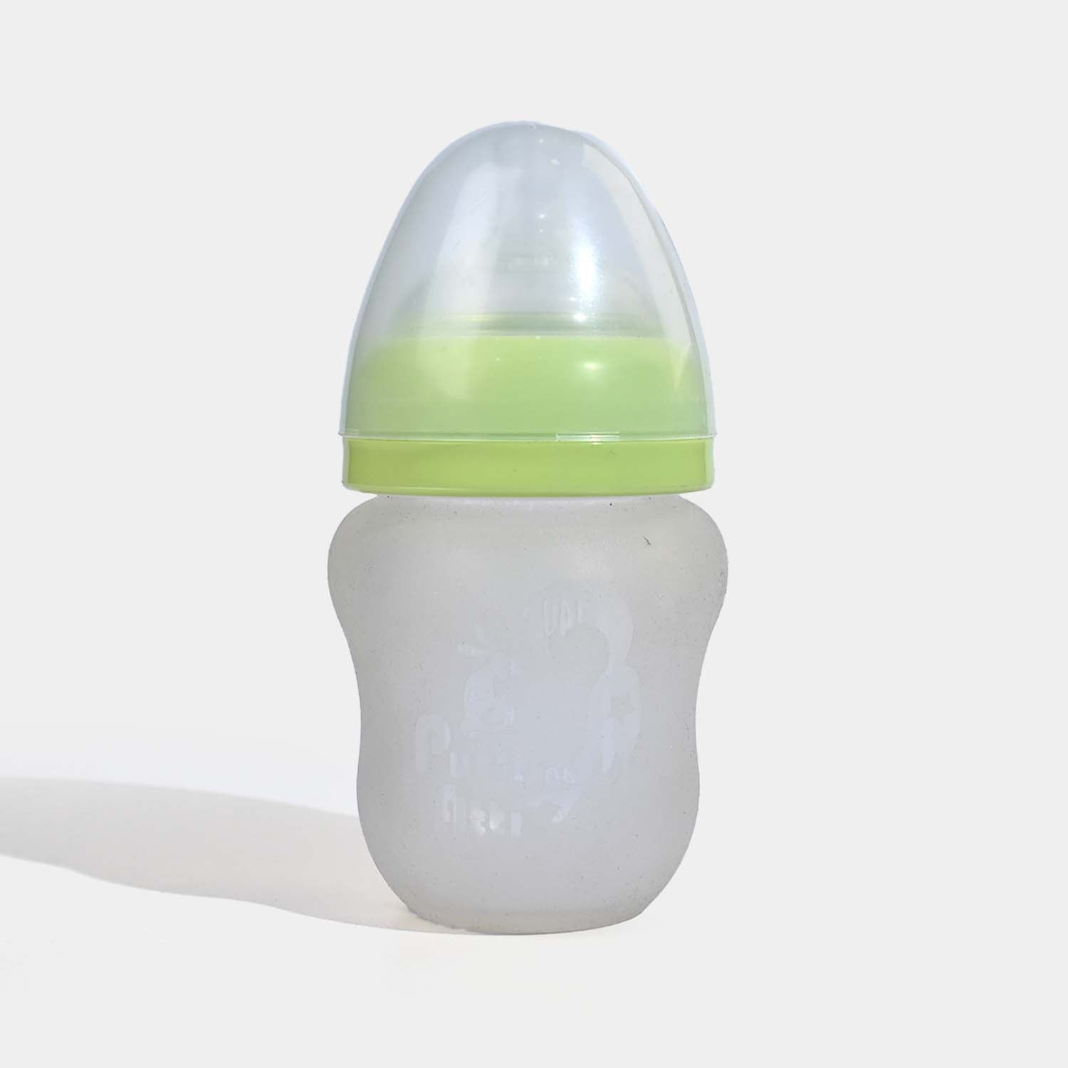 Soft silicone feeding bottle with patented air valve system designed to minimize colic and discomfort during feeding.