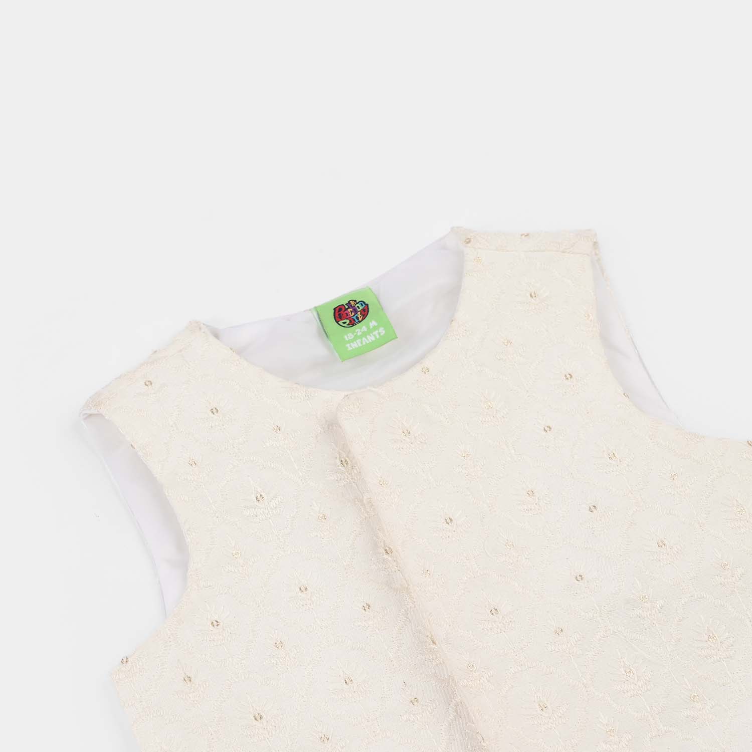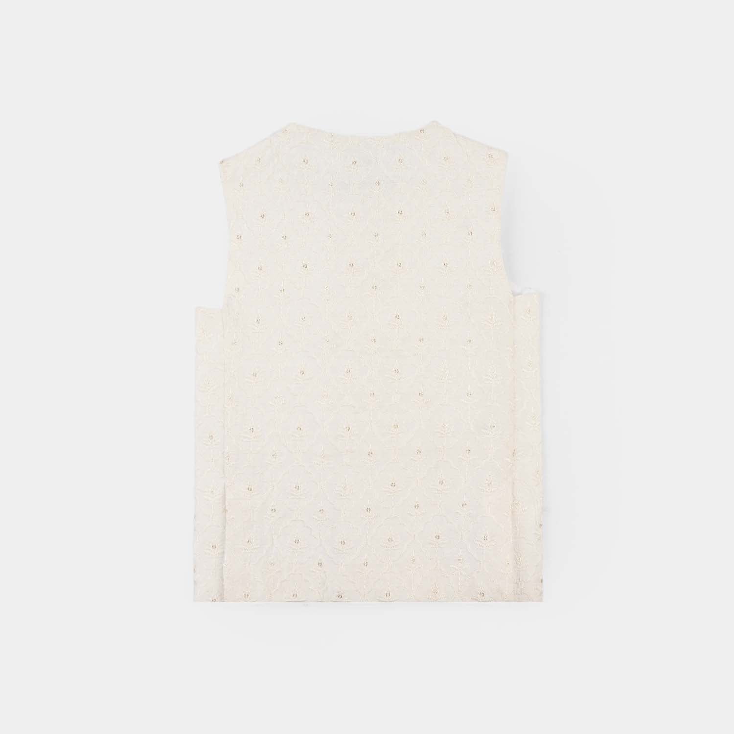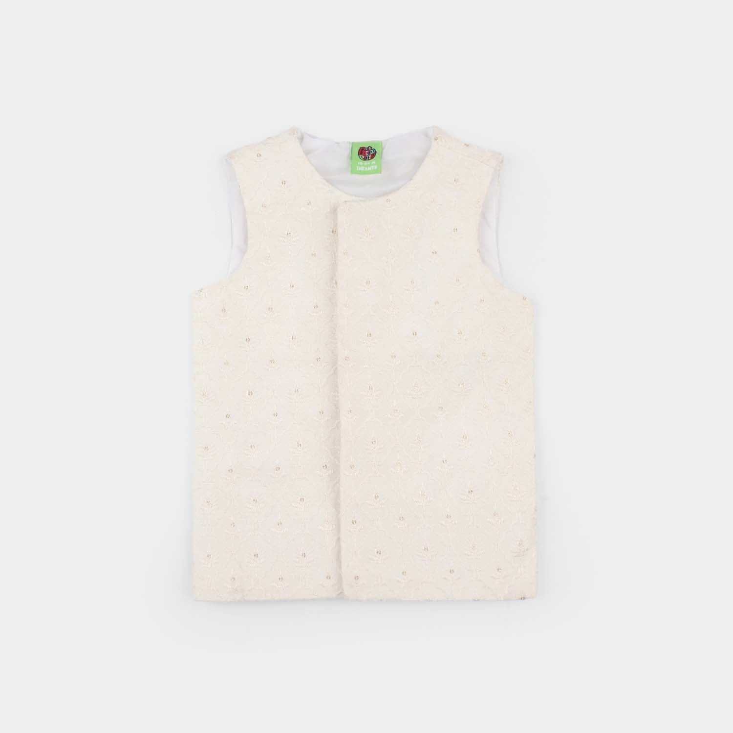 Infant boys' white poly viscose waistcoat featuring a classic fit and sleek design, perfect for layering over a kurta or 3-piece suit for a smart and stylish everyday look.
