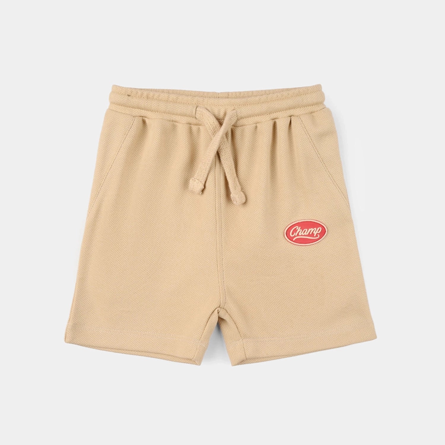 Infant boys' knitted shorts in brown feature CHAMP embroidery for a comfortable everyday look.