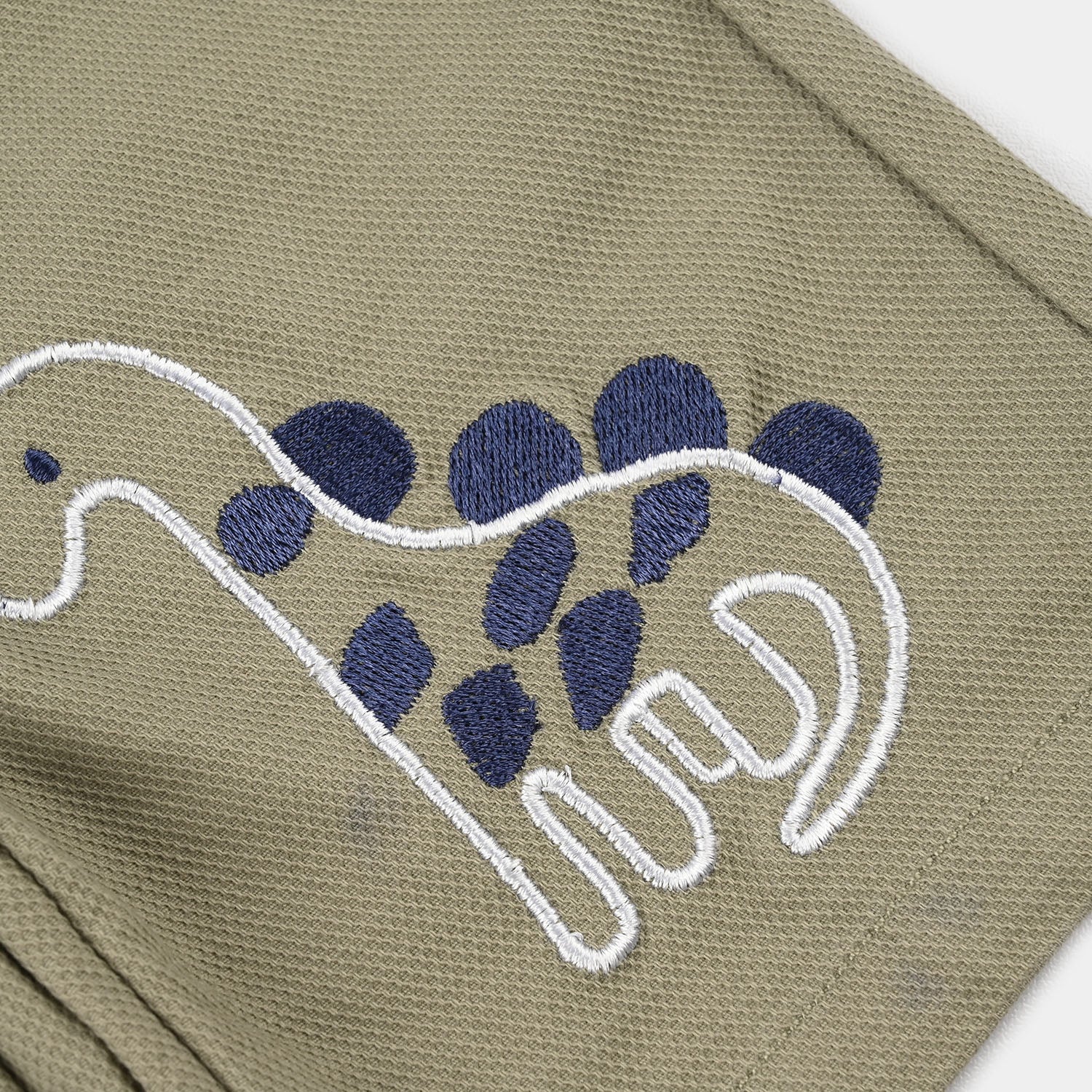 This green rigid denim overall for infant boys features a playful “Little Dino” design, perfect for comfortable and casual everyday wear.