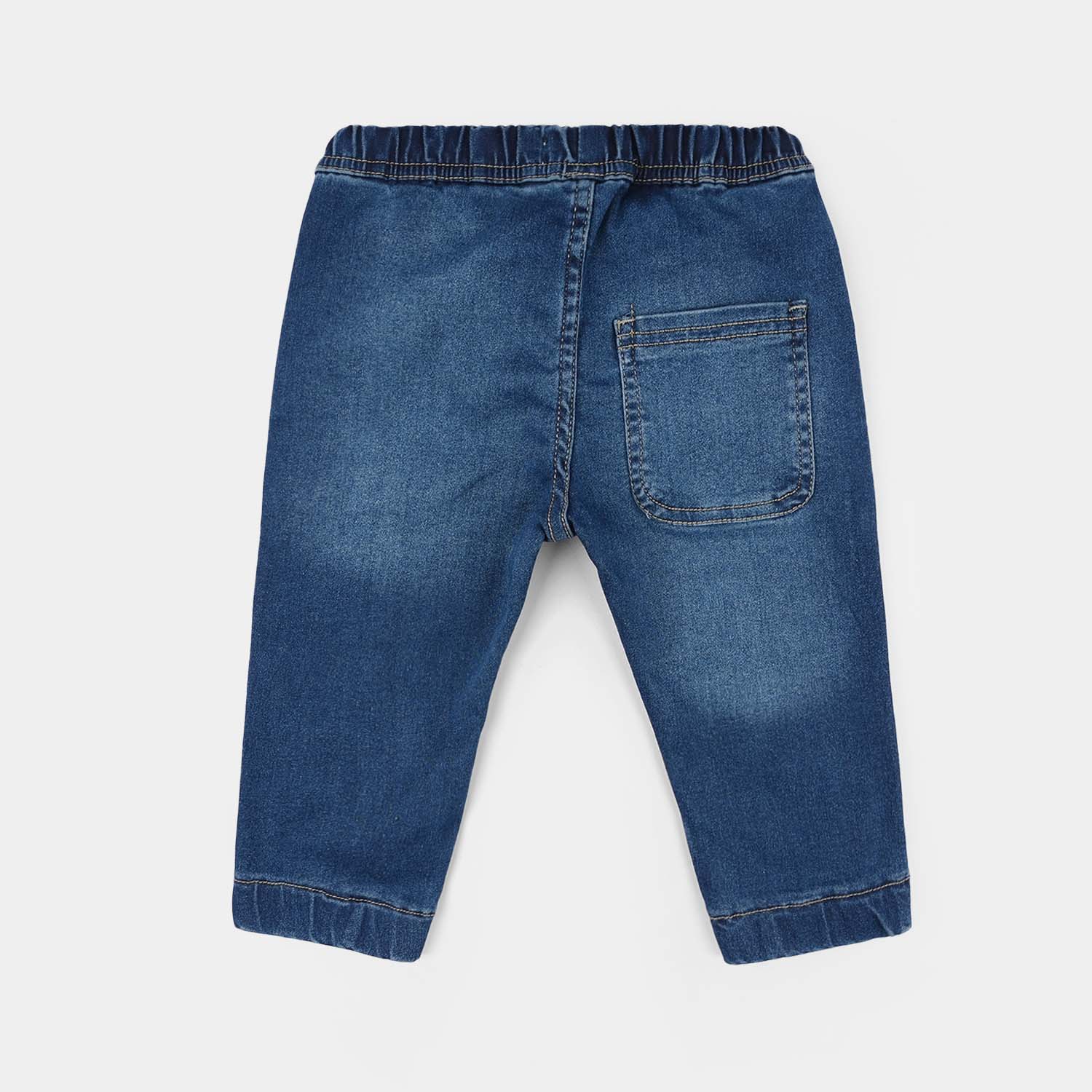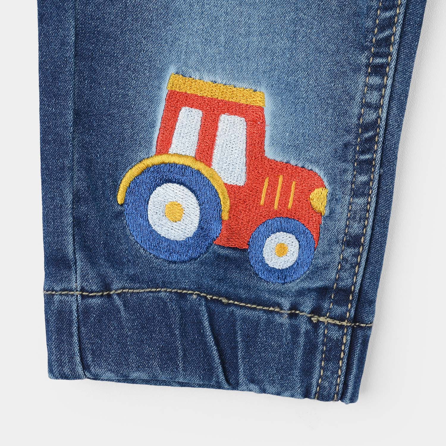These mid-blue denim viscose pants for infant boys feature a car-embroidered truck design, pockets, and a comfortable fit, perfect for everyday casual wear.