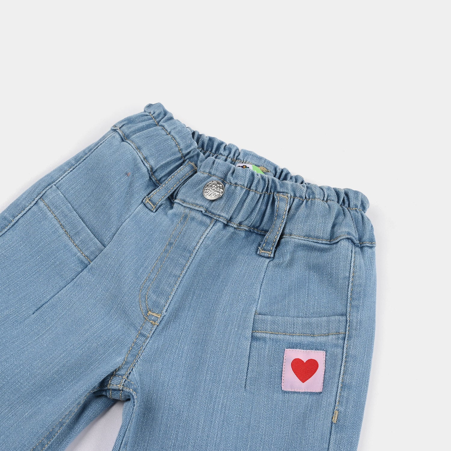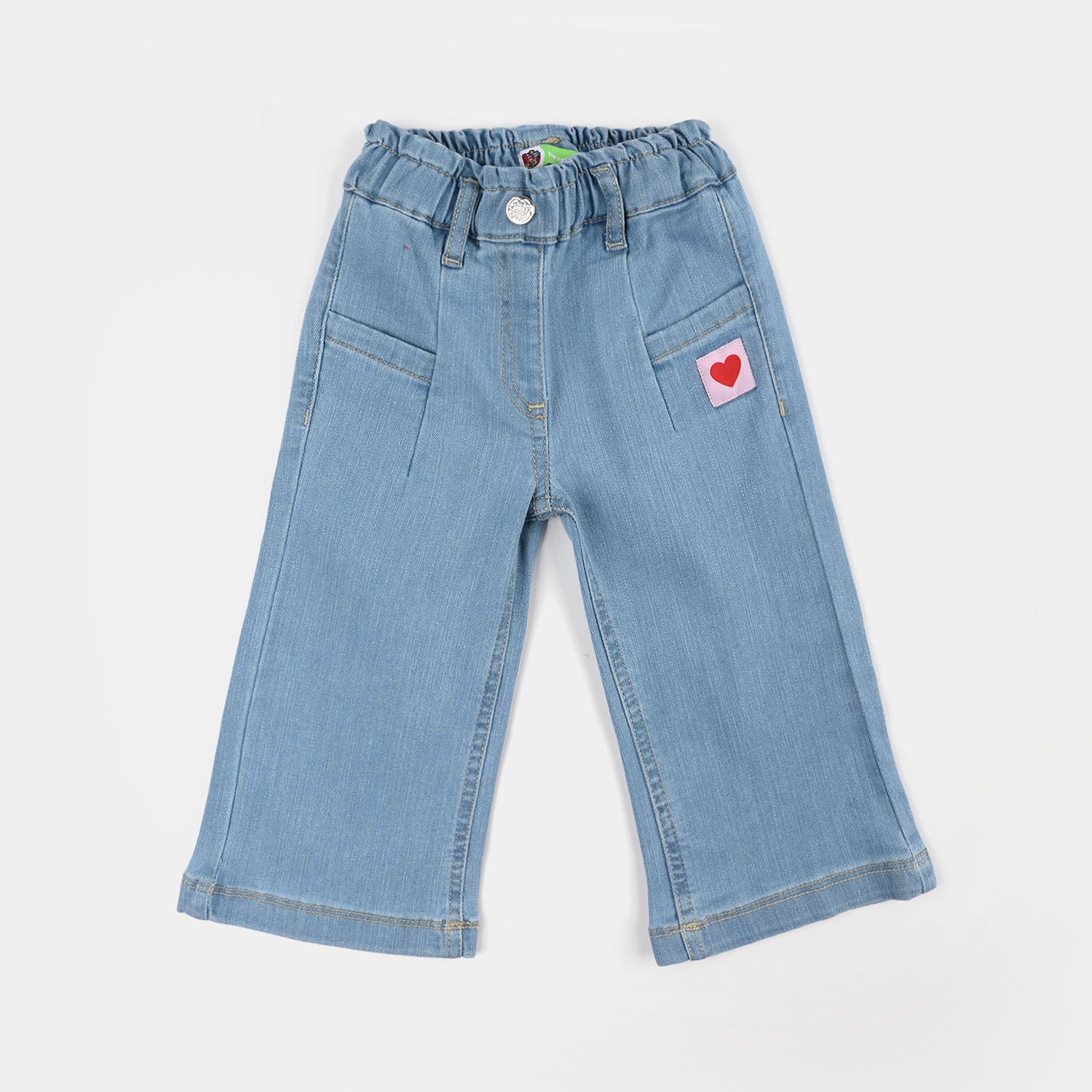 Infant girls' dark blue denim stretch pants featuring a heart theme, elastic waistband, wide leg fit, and functional pockets, perfect for a stylish and comfortable everyday look.
