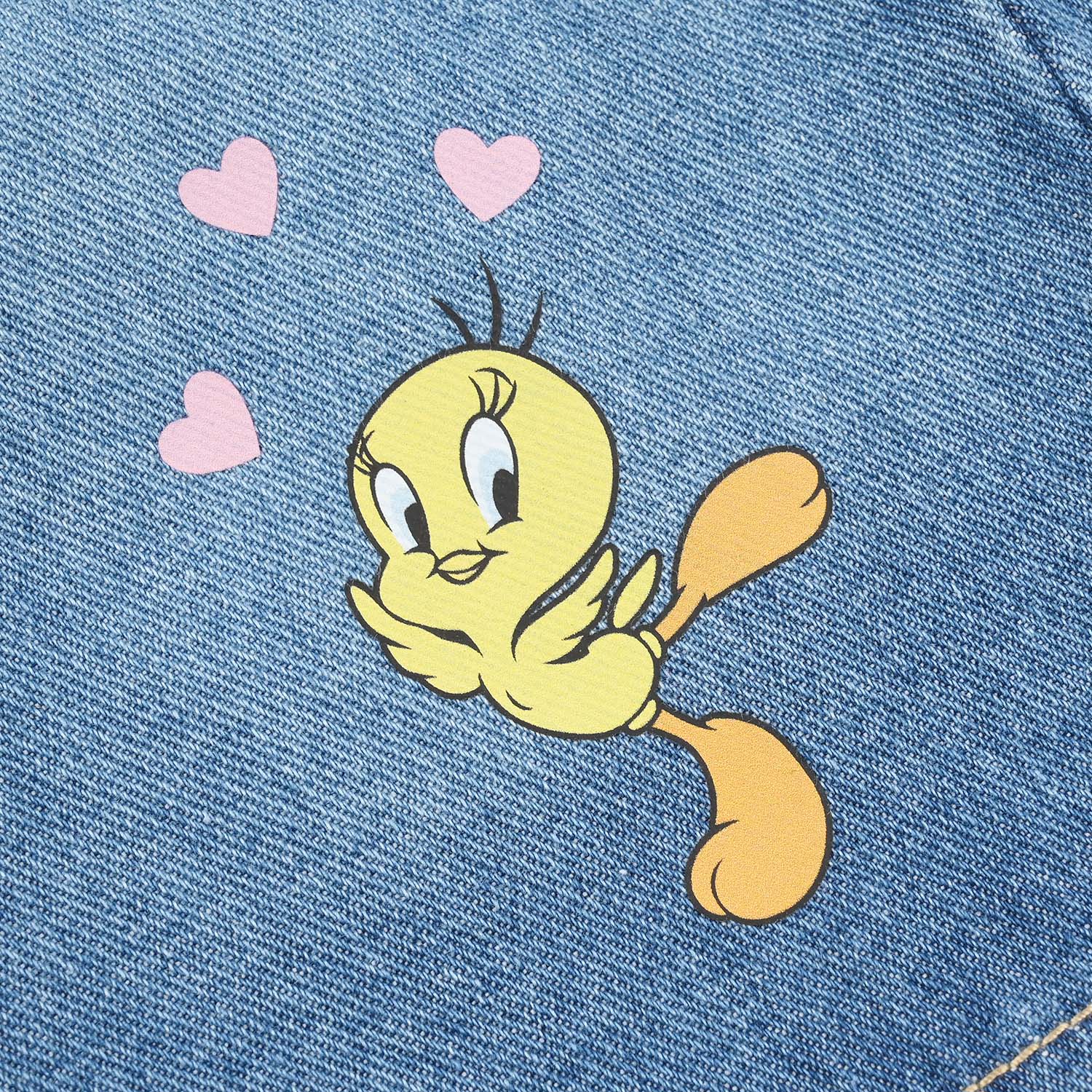 Infant girls' dark blue denim stretch pants featuring a Tweety theme and functional pockets, perfect for a stylish and comfortable everyday look.