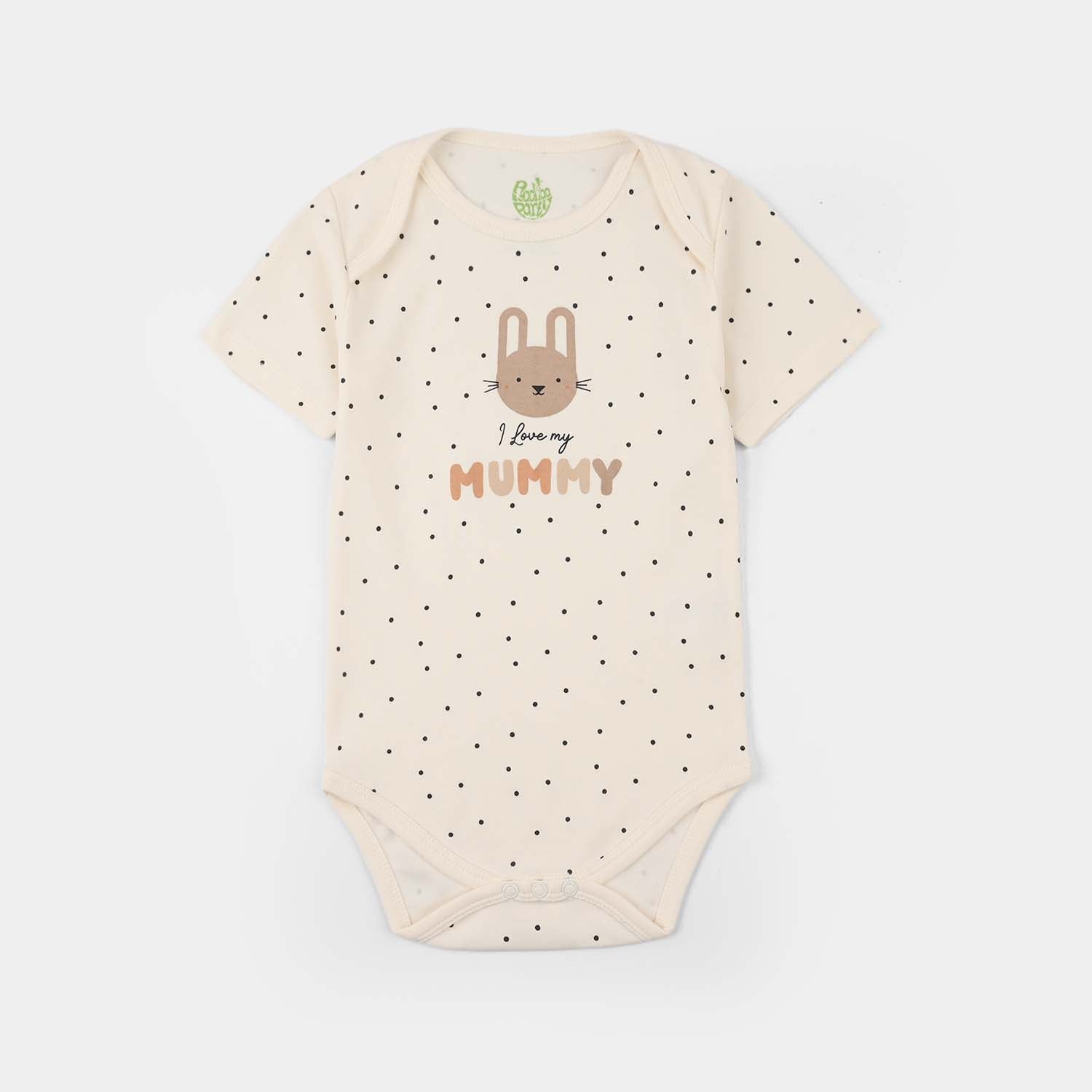 Infant girls’ cotton interlock romper in off-white featuring a round neck, half sleeves, printed “I Love My Mummy” text, and soft stretch fabric, perfect for a cute and comfortable everyday look.