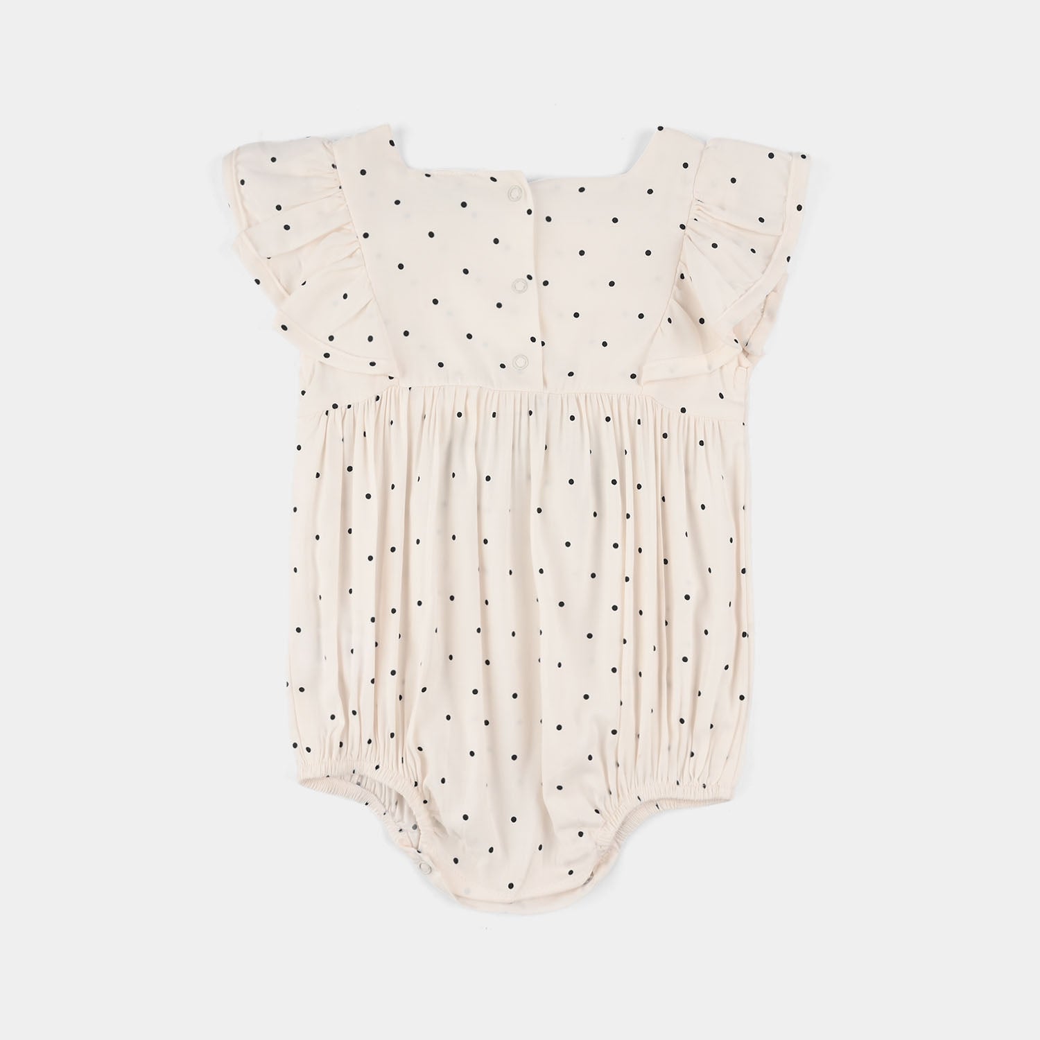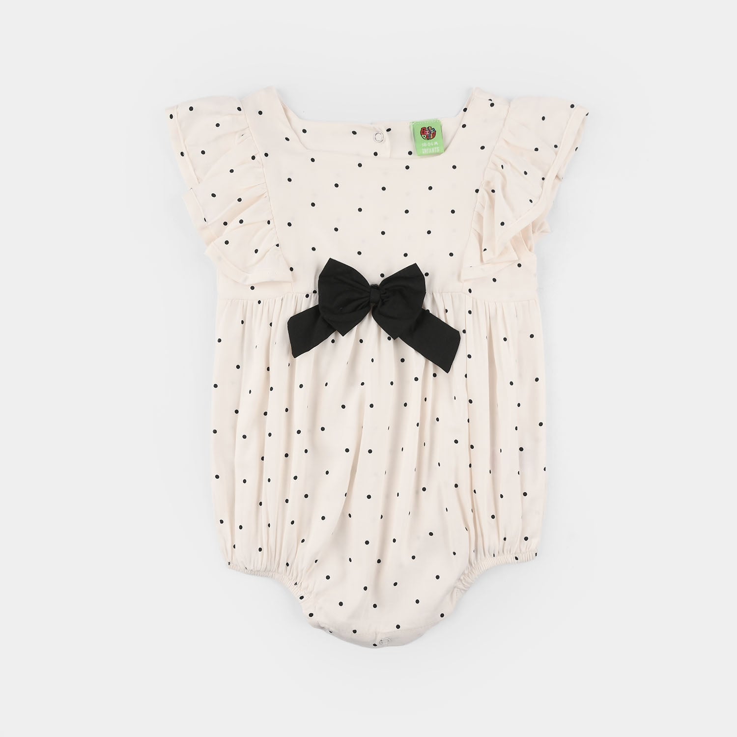 Infant girls' off-white cotton viscose woven romper featuring all-over polka dots, bow embellishment, and ruffle detailing, perfect for a cute and comfortable everyday look.