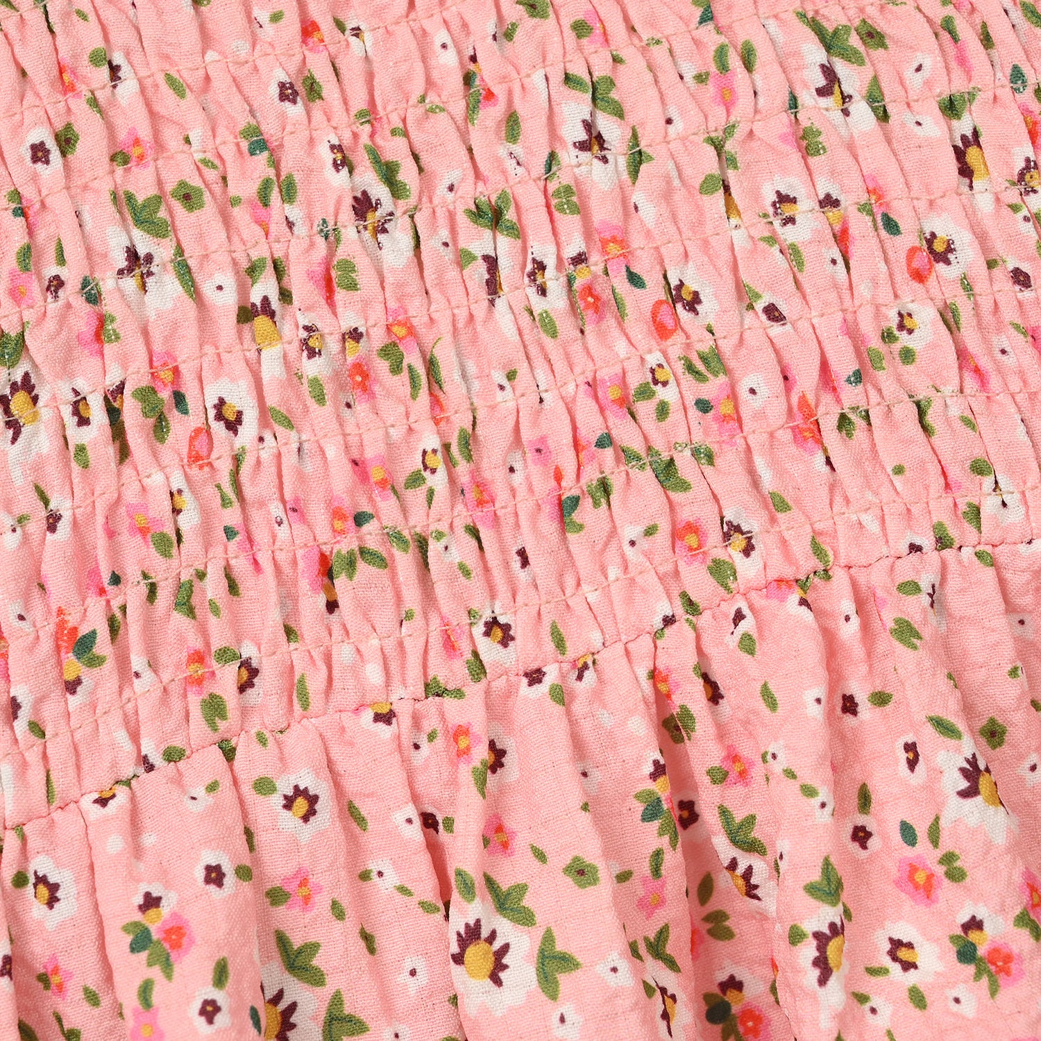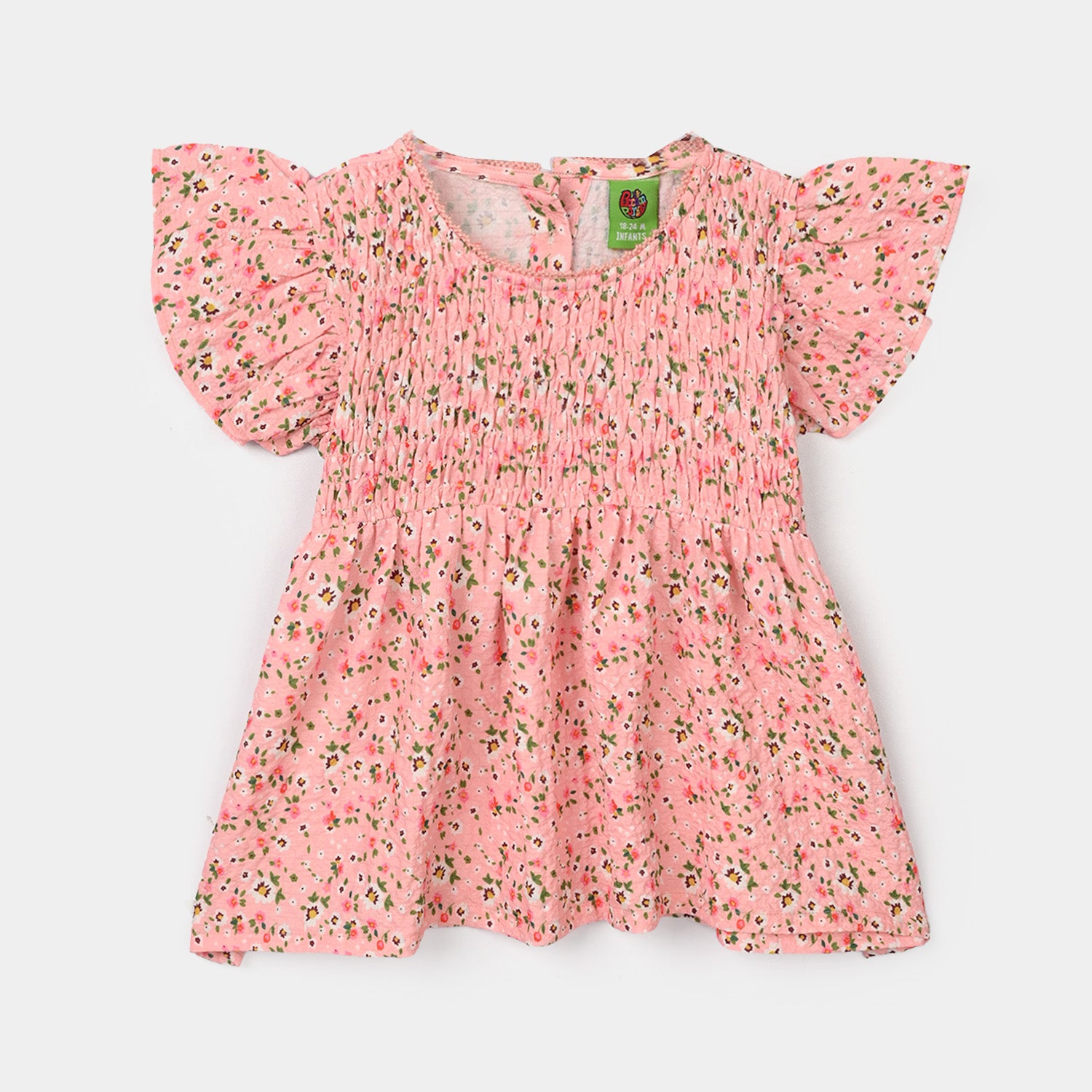 Infant girls pink cotton frock top featuring frill sleeves and fitted elastic body, perfect for comfortable and stylish everyday wear.