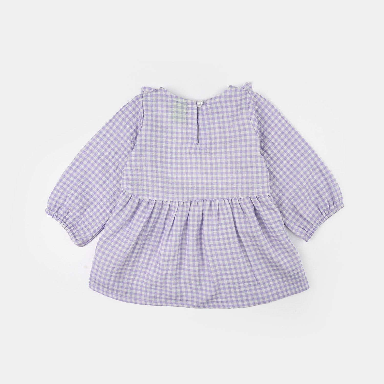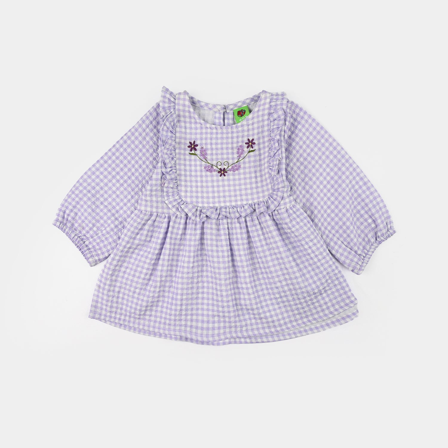 Infant girls' cotton embroidered top in lilac featuring a round neck, ruffle detailing, full sleeves, pleats detailing, and delicate embroidery, and it can be paired with any bottom.