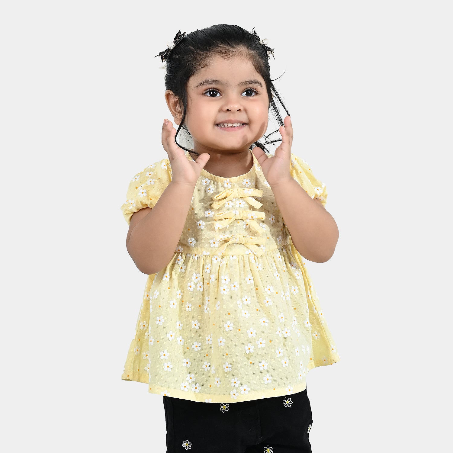 Baby girl yellow top with all-over floral print, half sleeves with elastic hems, round neck with front bows, and frock-style design.