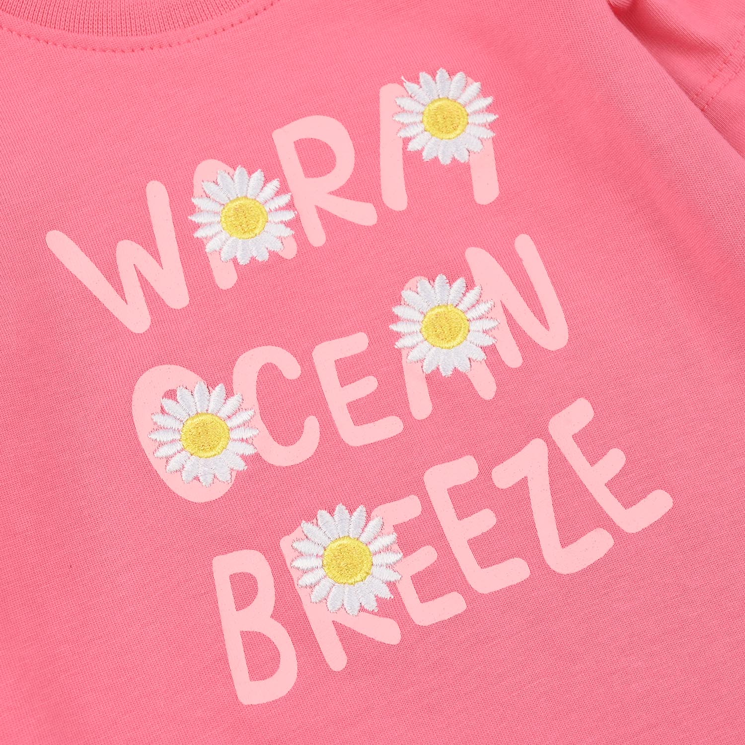 Infant girls’ jersey T-shirt with a round neck and half sleeves, featuring “World Ocean Breeze” text on the front, comfortable and easy to pair with any bottom all day long.