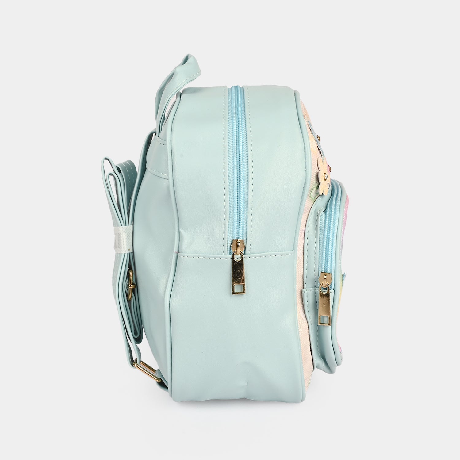 This charming backpack in green features a floral-themed embellishment with a glittery, shimmery effect, adding a fun and eye-catching sparkle to a playful design.
