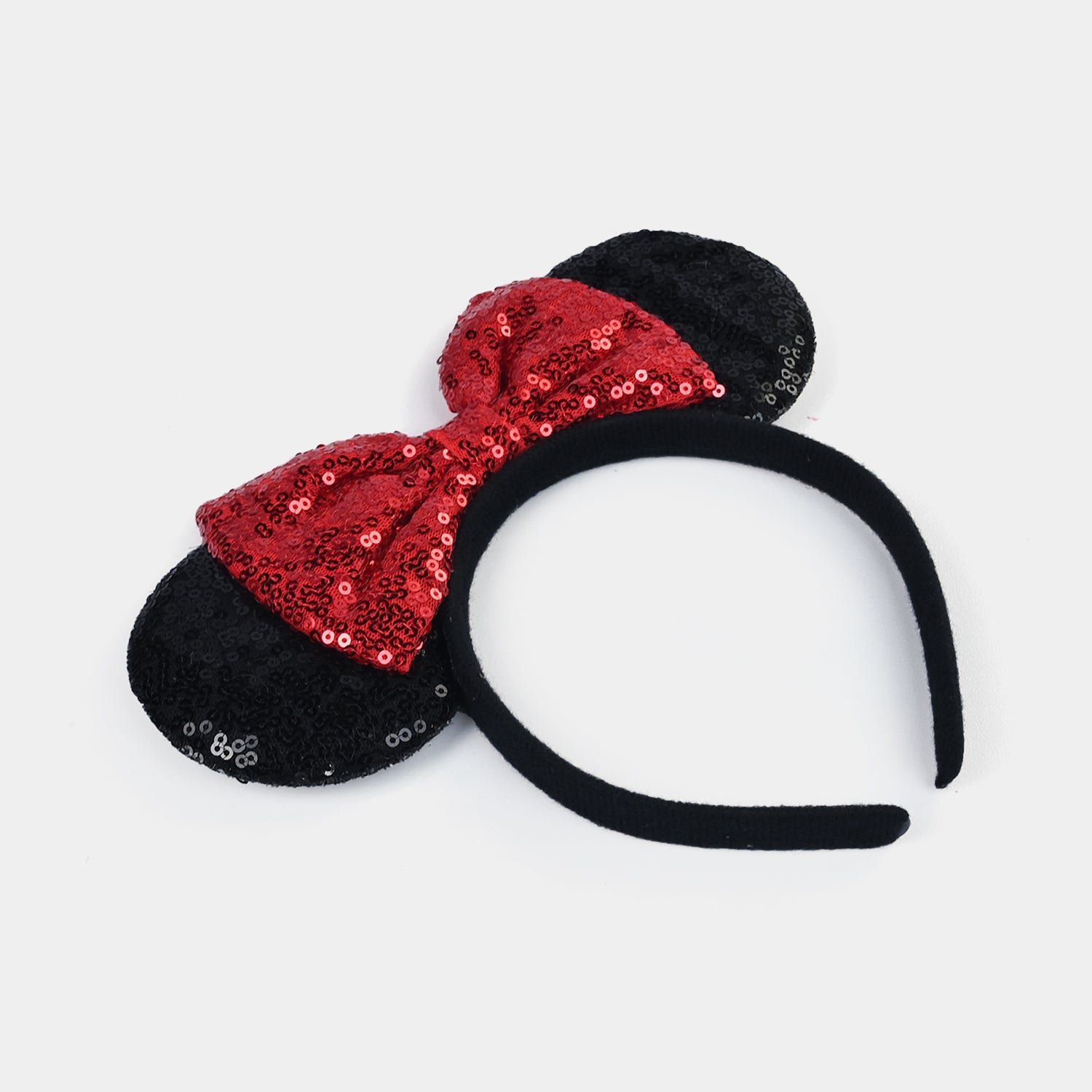 This playful headband features black sequin ears and a sparkling red sequin bow, adding a fun and festive touch to any outfit.