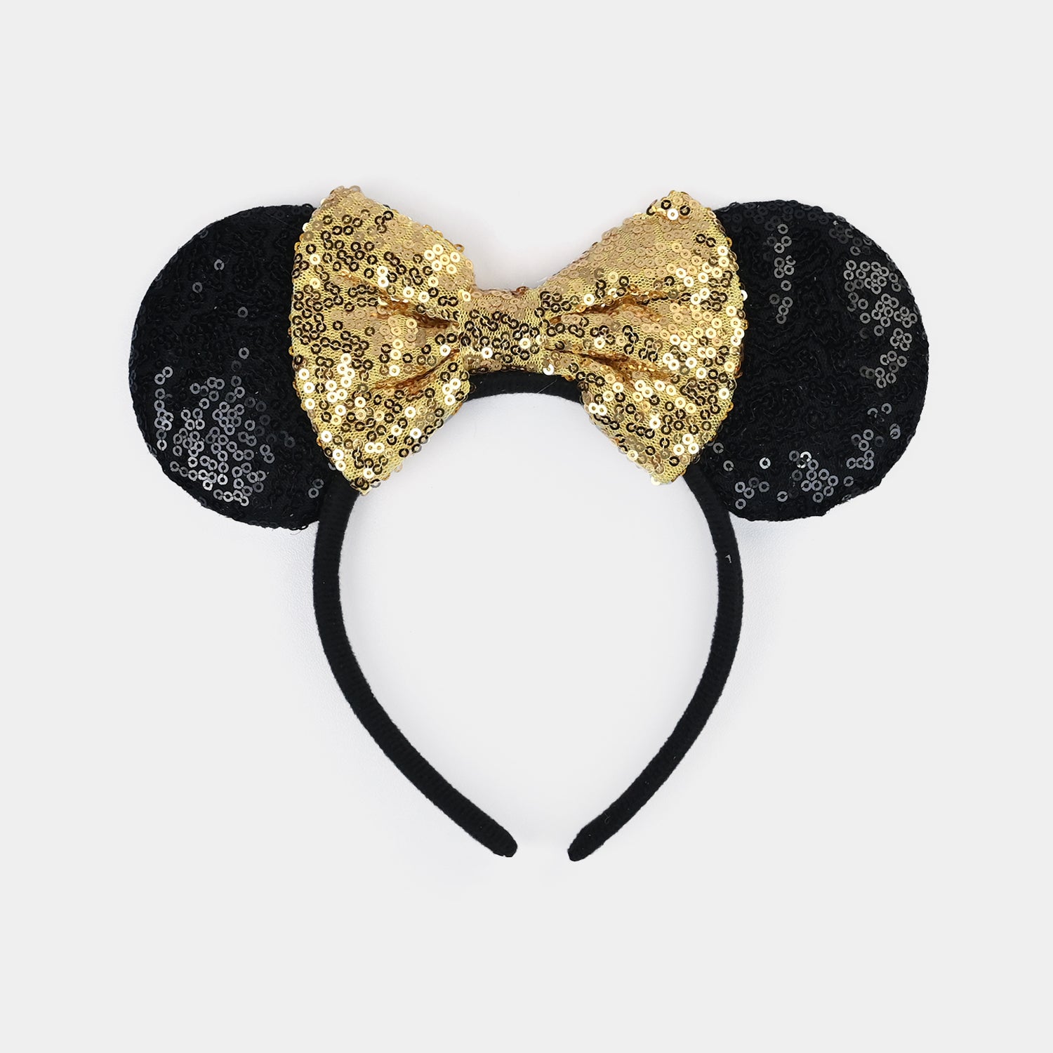 This playful headband features black sequin ears and a sparkling gold sequin bow, adding a fun and festive touch to any outfit.