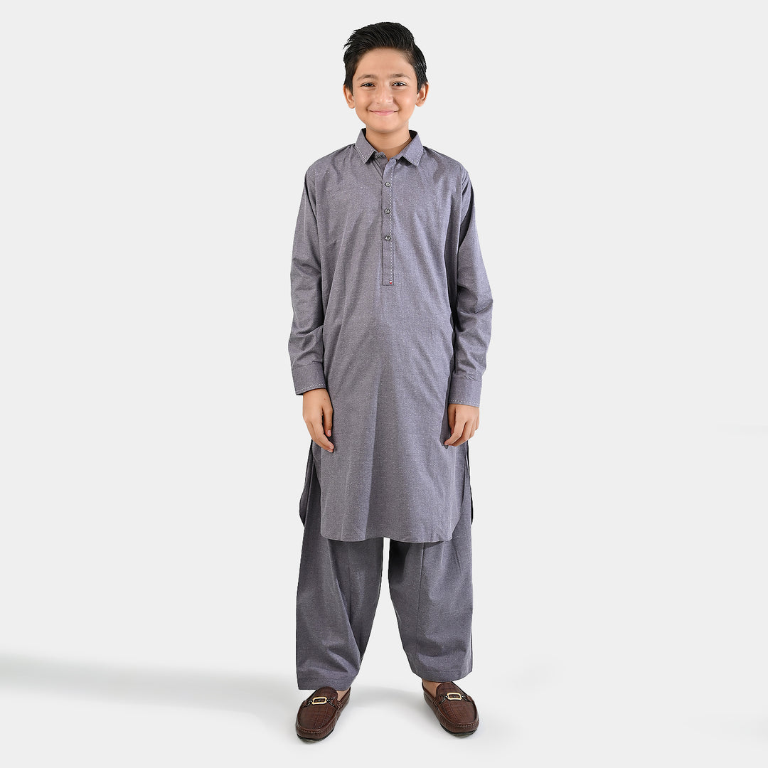 Boys Yarn Dyed Shalwar Suit (Ban Collar)-Grey Stripe