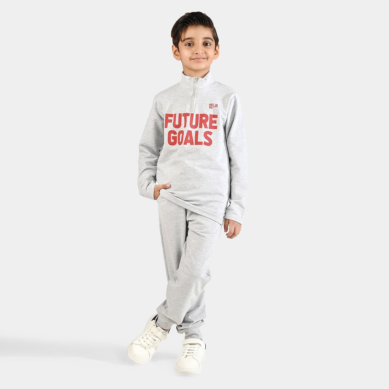 The Boys Jersey/Terry 2-Piece Suit Future Goals in Grey combines comfort and style with soft, breathable fabric and durable design. Featuring a stylish neck zipper, ripped sleeves, and ripped trousers, it’s perfect for active boys who want to look cool while staying comfortable.
