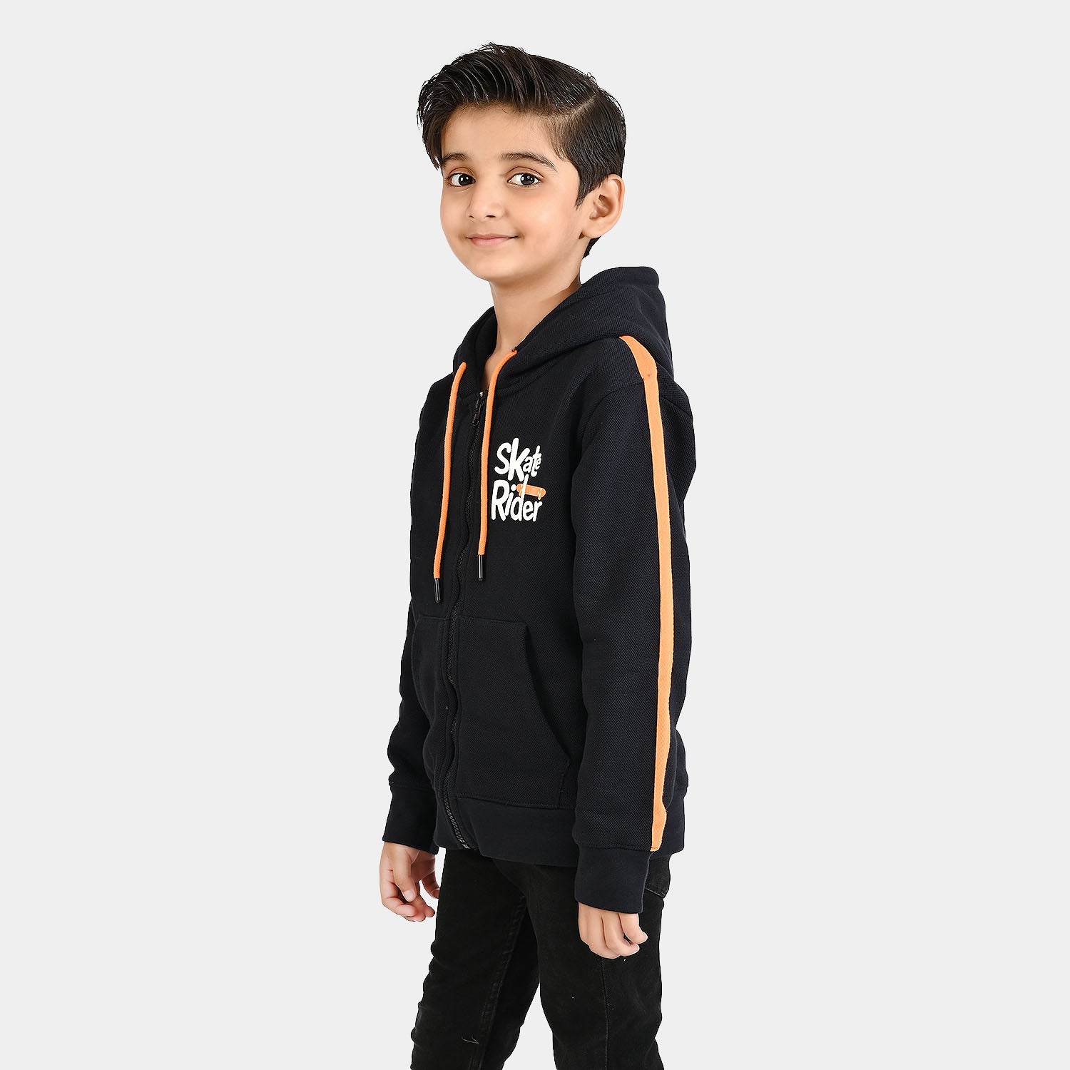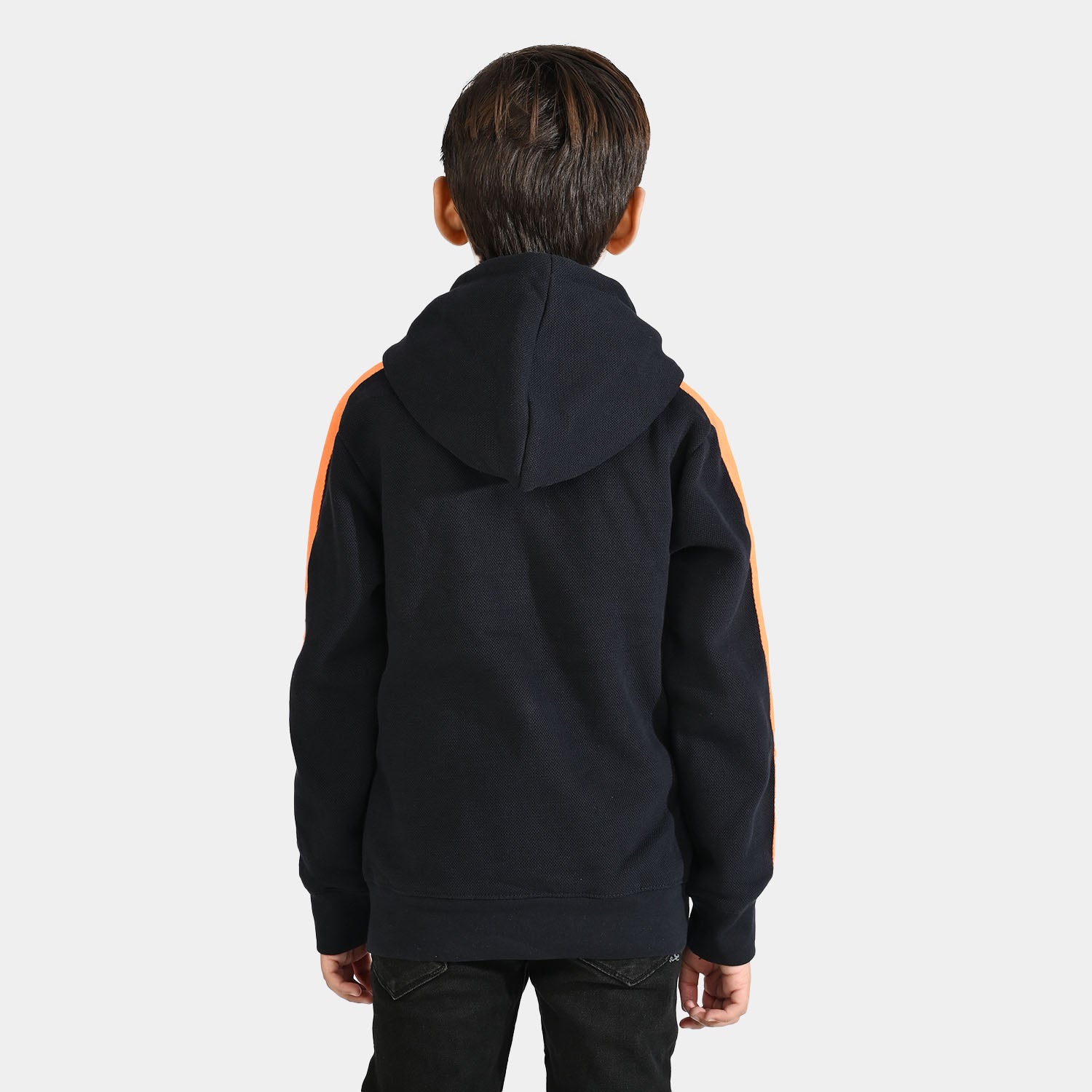 Our Boys’ Jumbo Pique Knitted Jacket comes with a hood, full sleeves, and a comfy regular fit, made from durable yet breathable jumbo pique fabric. It keeps him warm without overheating, whether he’s skating, exploring, or just hanging out. This one’s made to be his new favorite.