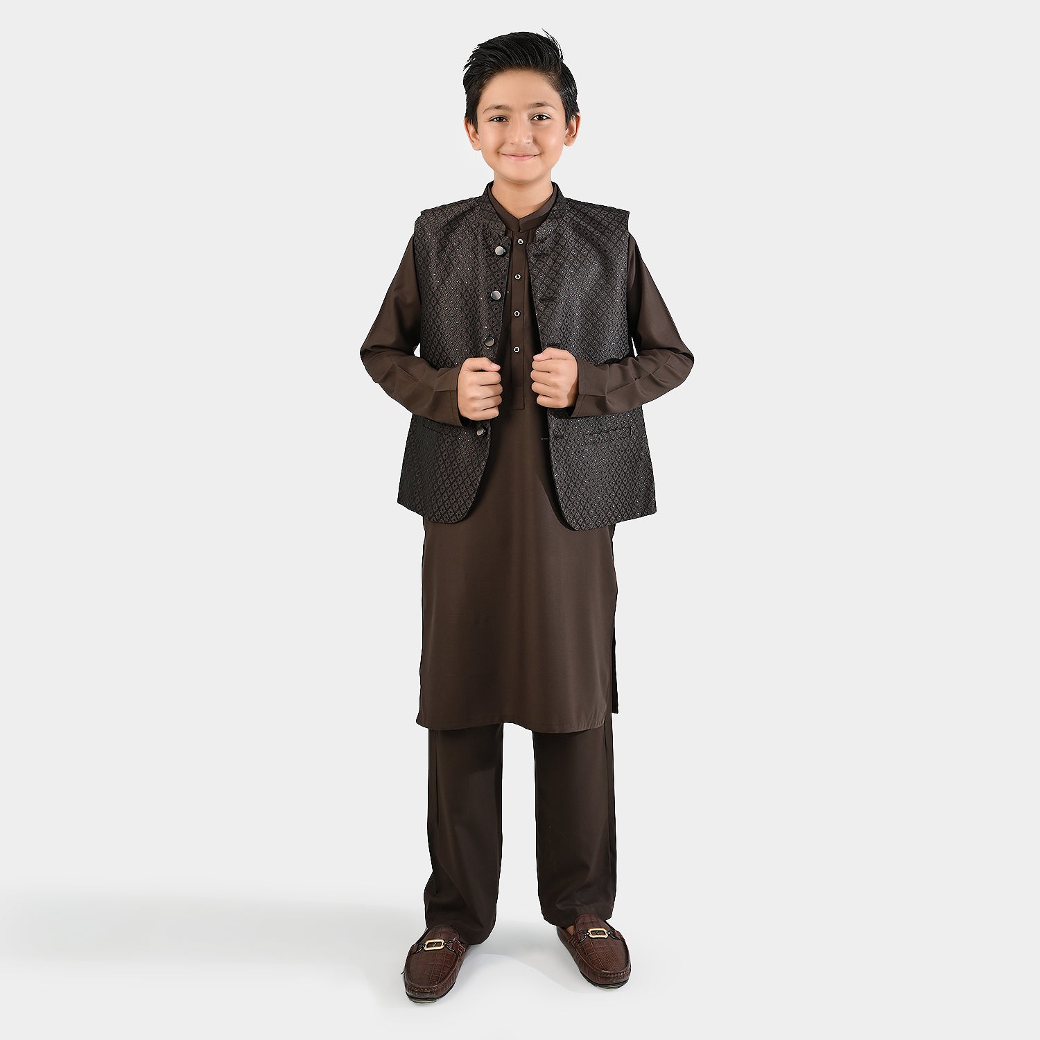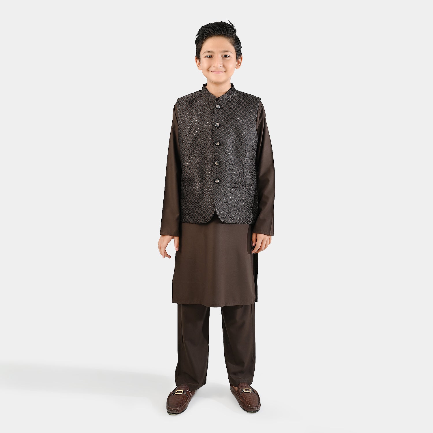 Bachaa Party brings you the best price Boys Poly Viscose 3 Piece Suit (Earth Tone)-BROWN with express shipping all over Pakistan.