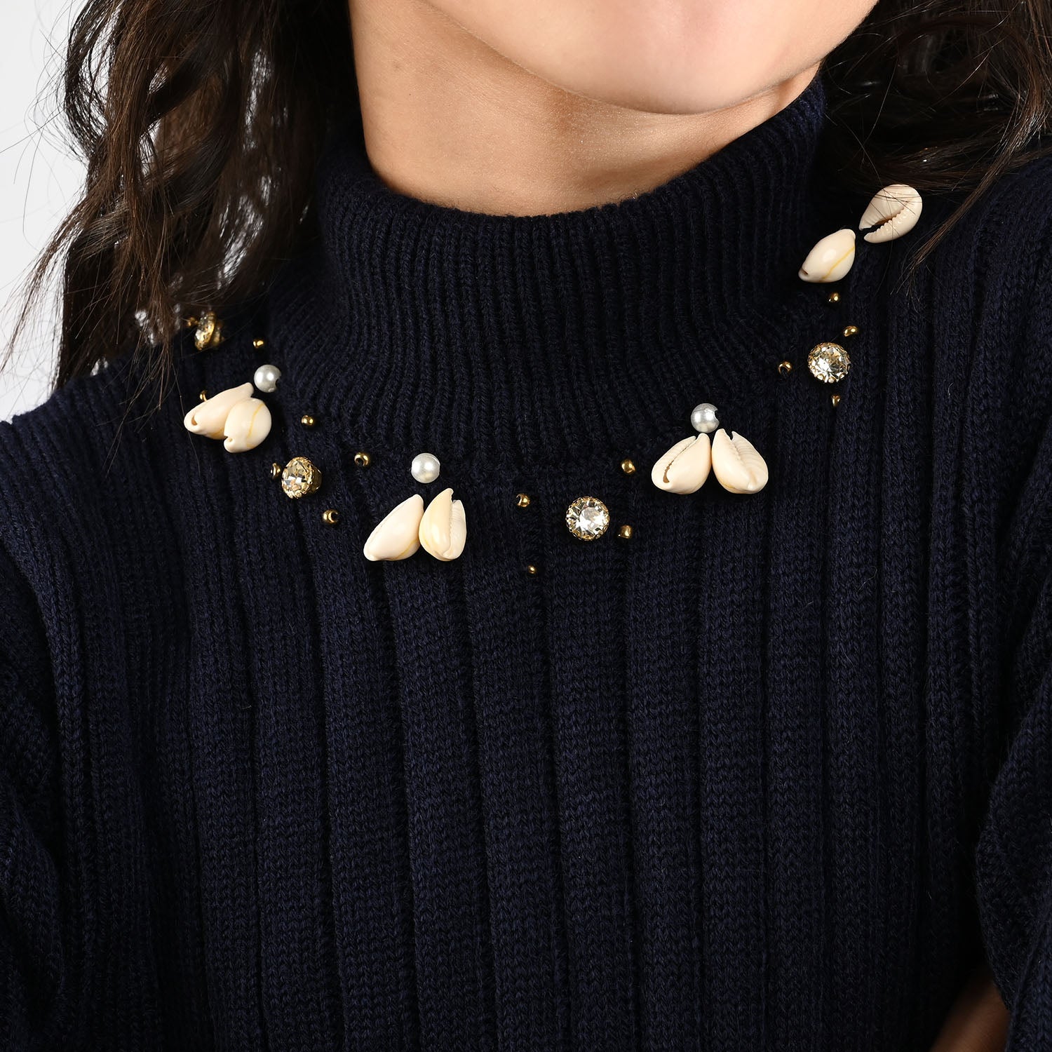 This sweater matches her lively spirit perfectly. It features a warm turtleneck, ribbed cuffs and hem for a secure fit, and decorative charms along the neckline.