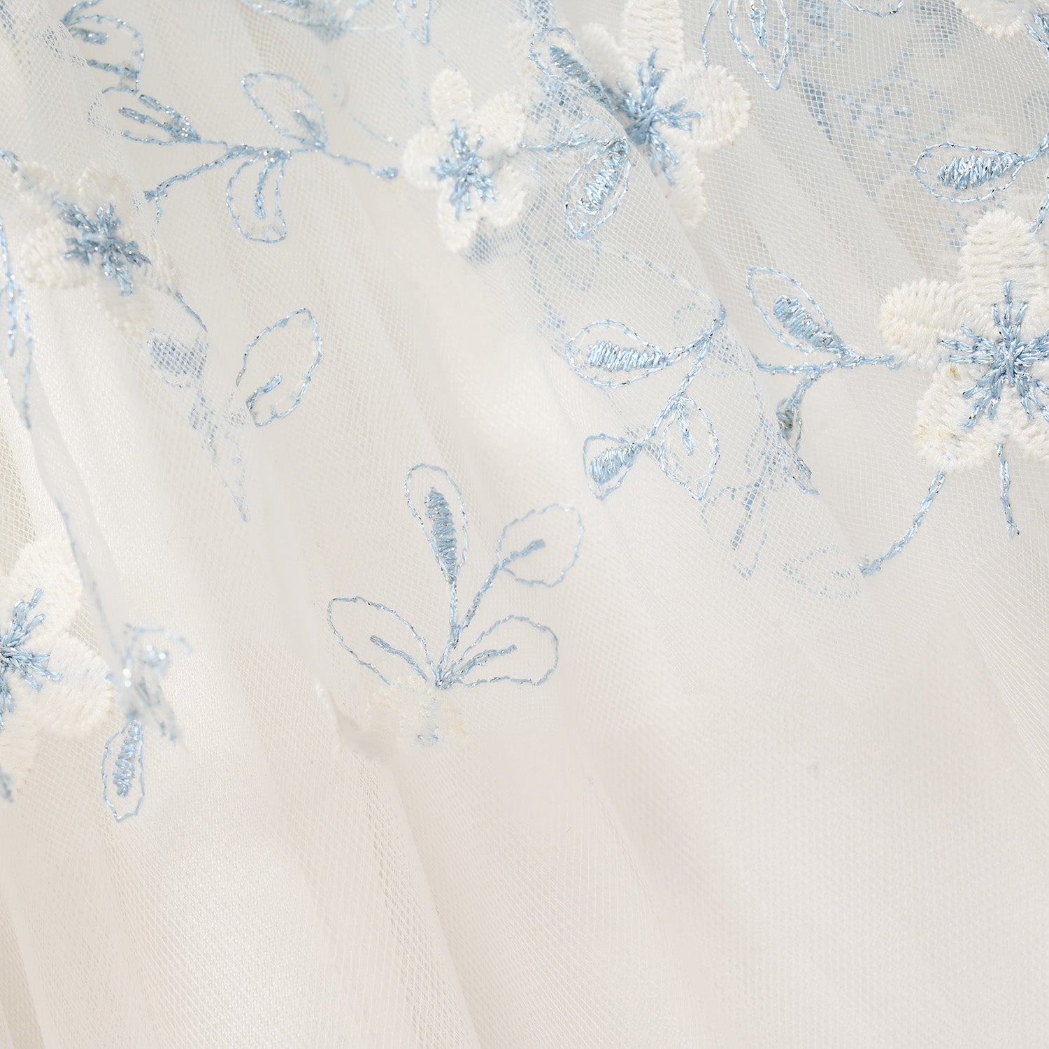 This infant white fancy net frock for girls features a round neck, bow with belt embellishment, and floral embroidered net, can be paired with tights or panties for a sweet, elegant look.