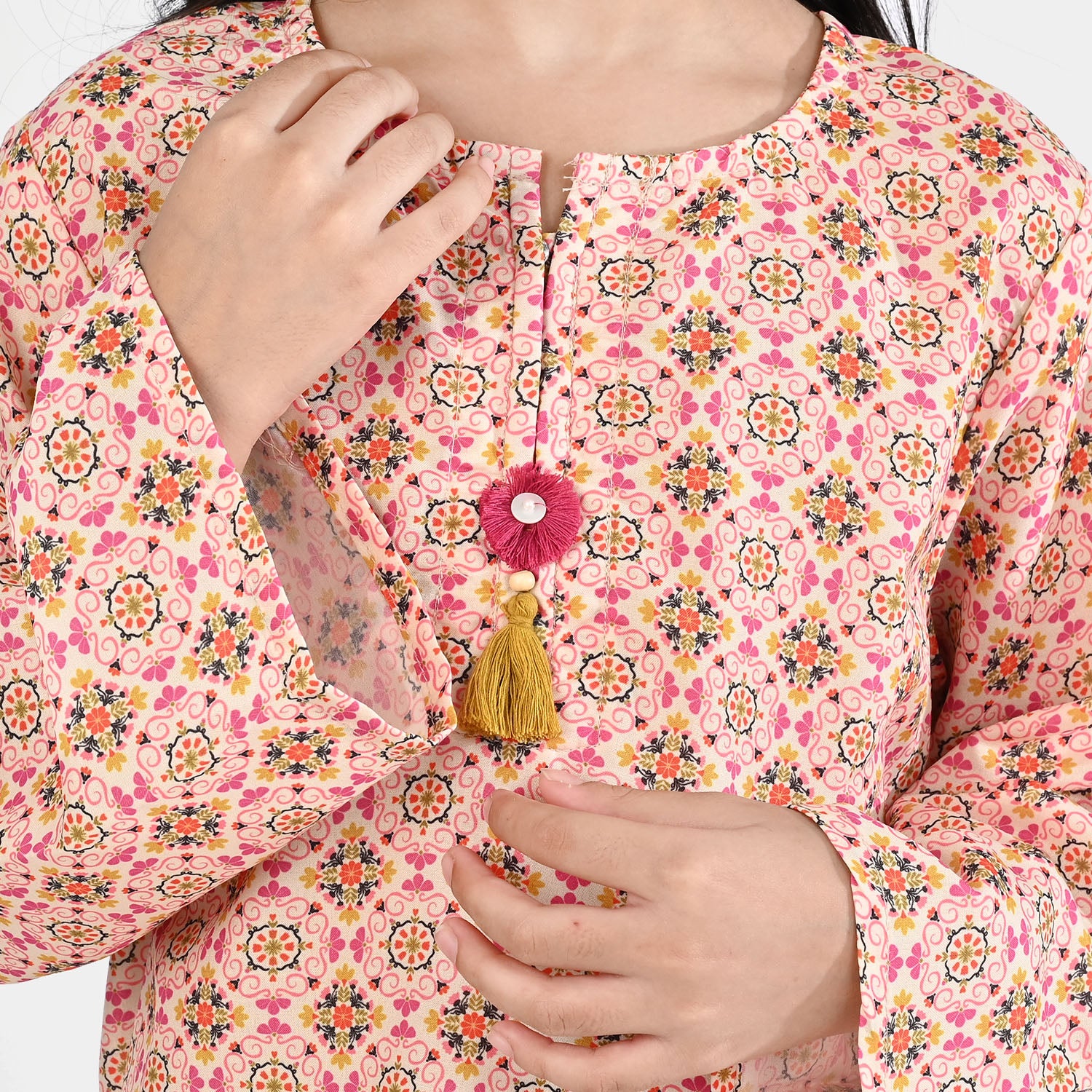 Pink/peach poly mesh printed 2-piece featuring a kameez with tassel detailing and full sleeves, paired with a matching shalwar.