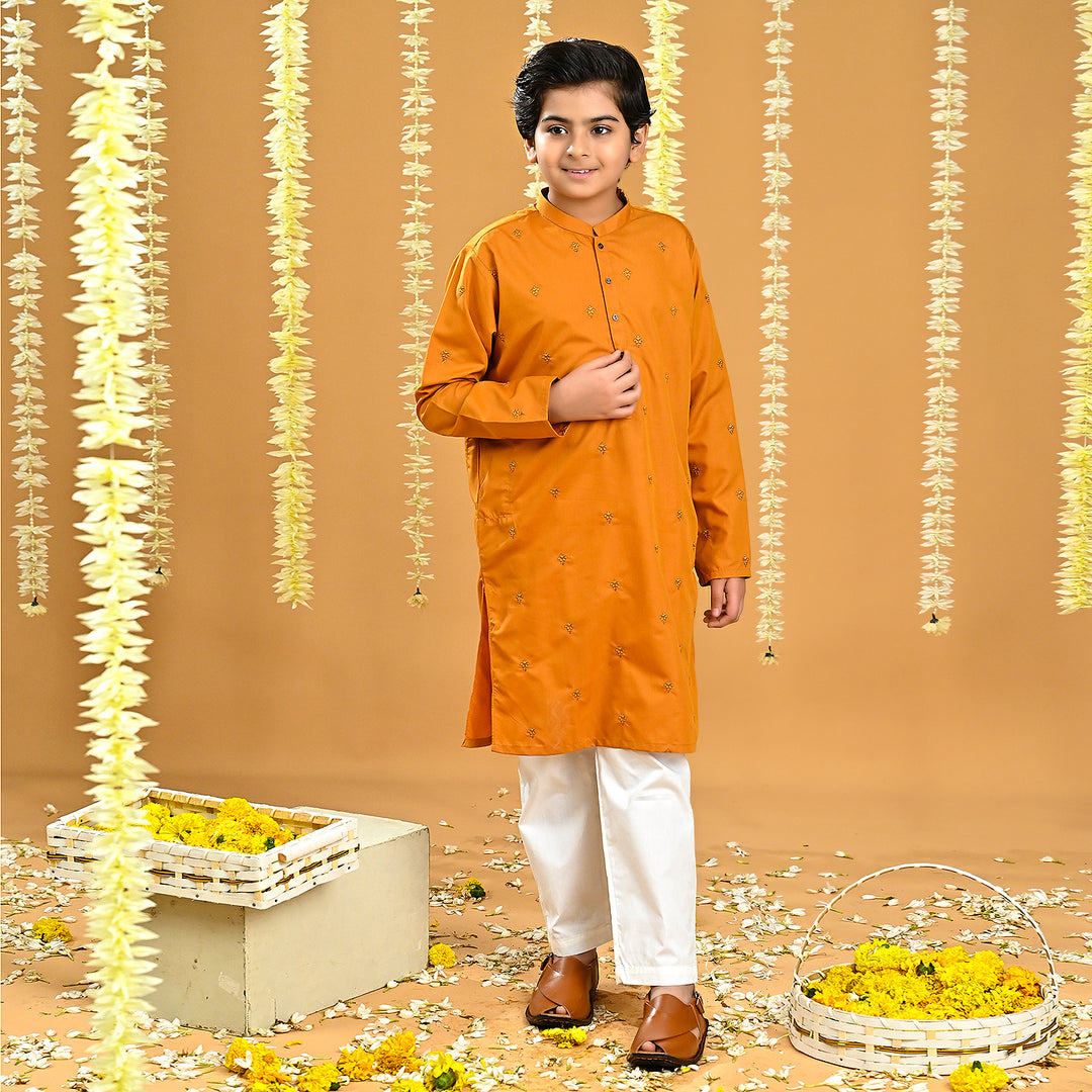 Boys Cotton Shalwar Suit (Dashed EMB)-Mustard