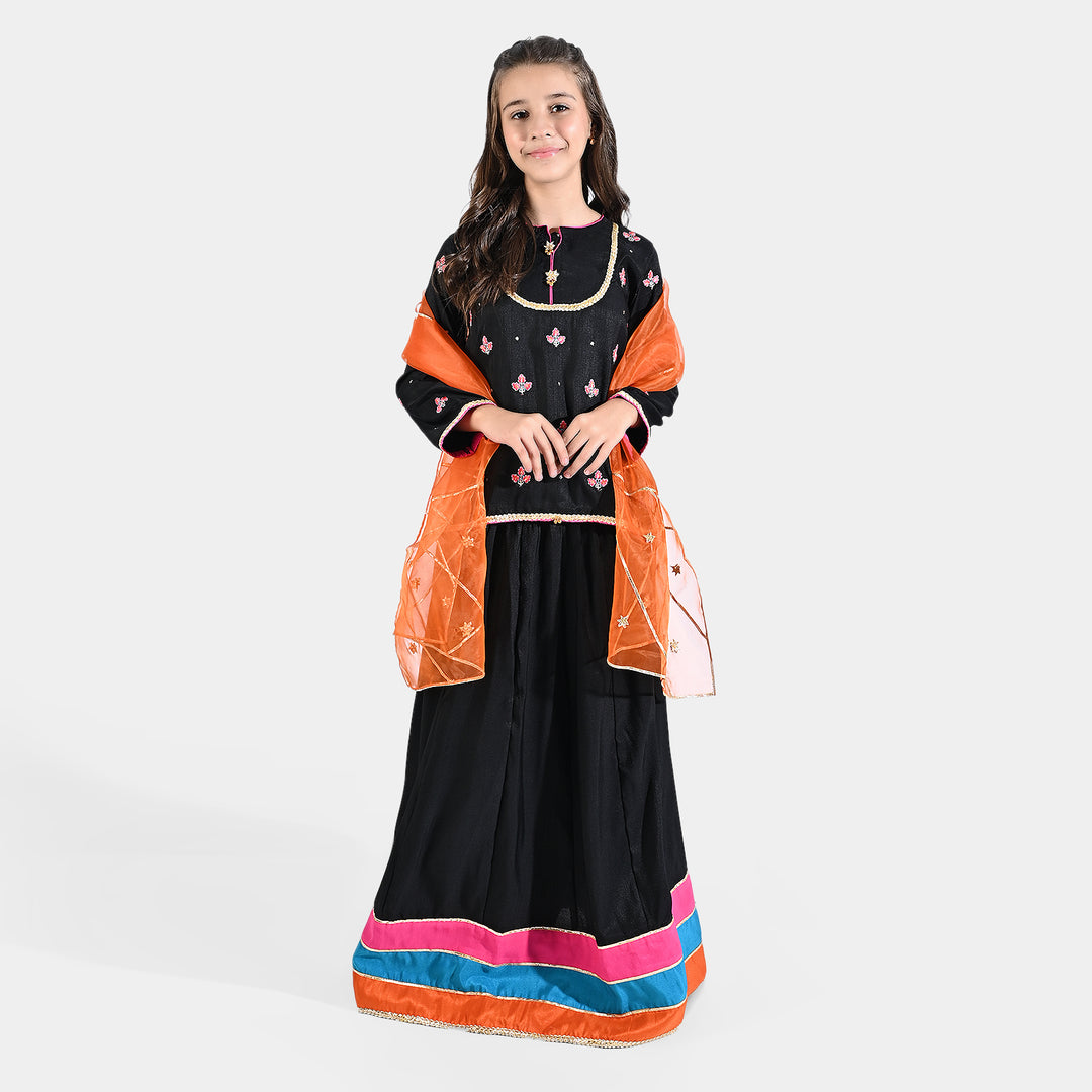 Girls Cotton Poplin EMB Long Kurti Surma-BLACK