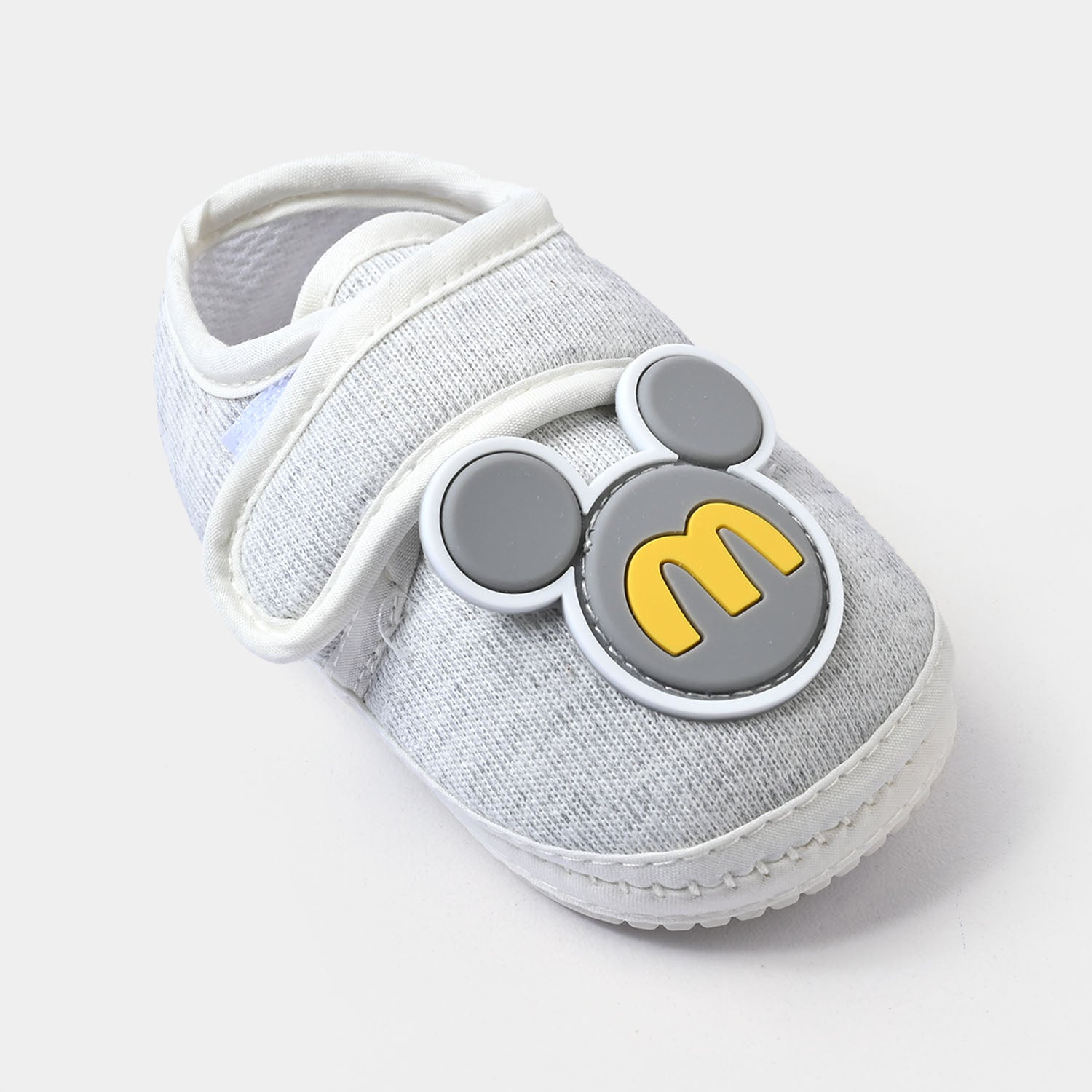 Cute grey shoes made from soft fabric, featuring a secure strap and a Mickey Mouse embellishment.