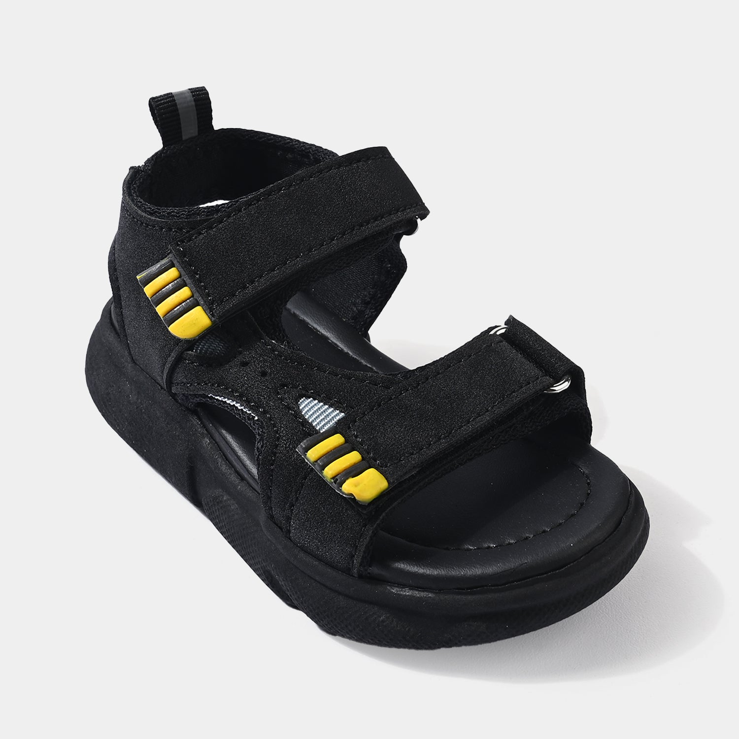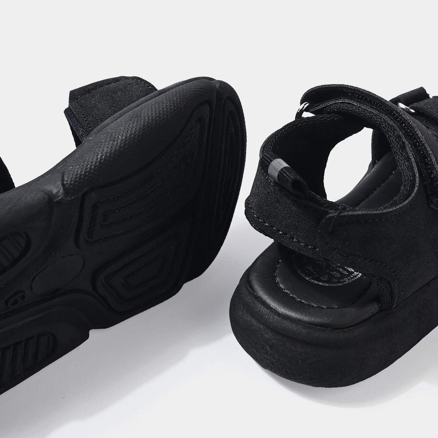 Boys’ black sandals feature a double-strap design with an adjustable strap for a secure and comfortable fit.