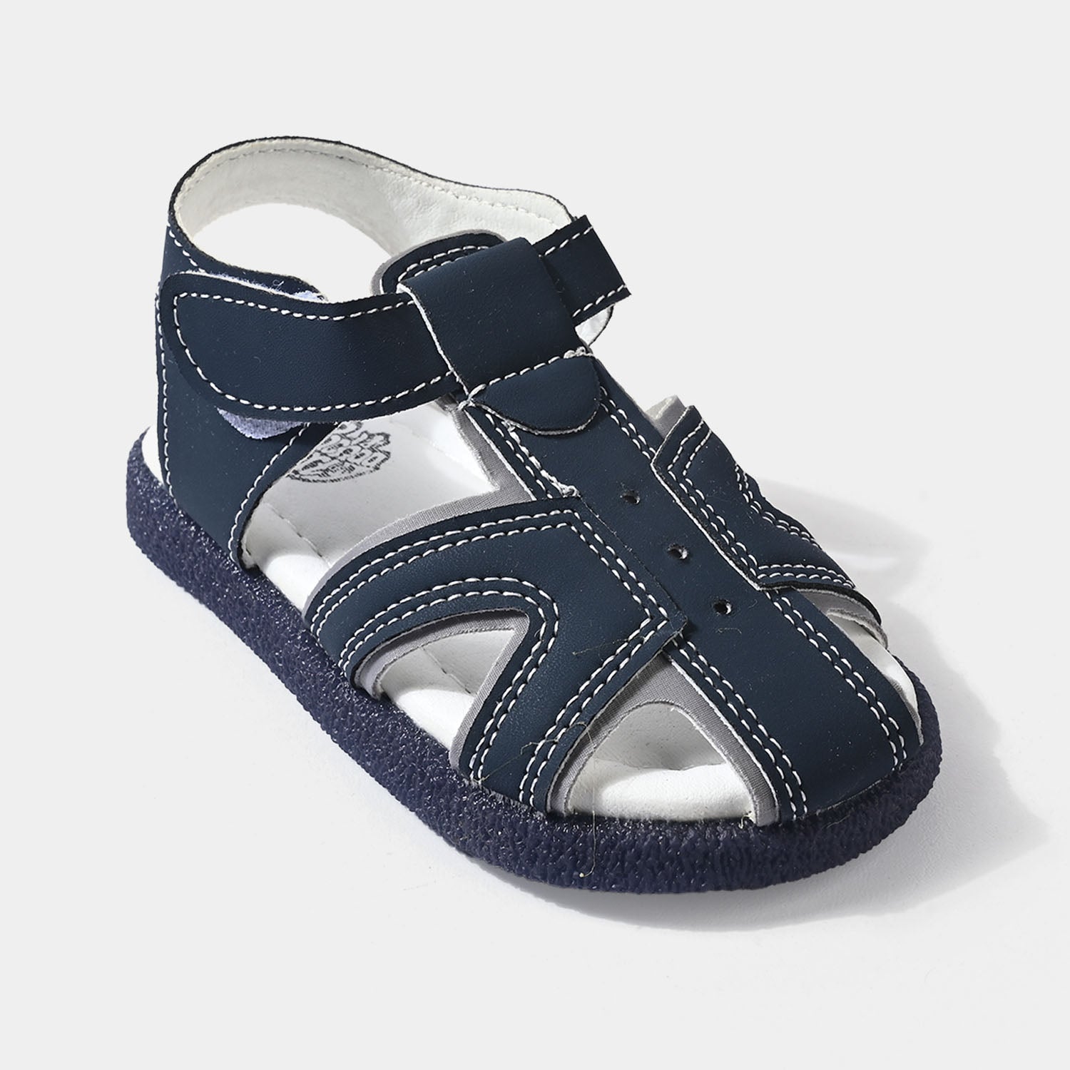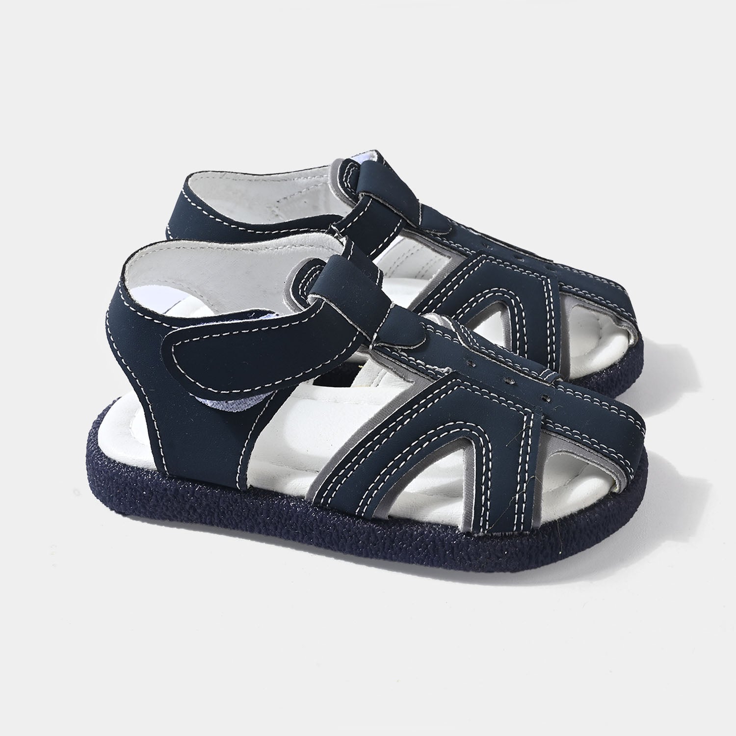 Boys' navy blue sandals featuring an adjustable Velcro strap, cushioned footbed, non-slip sole, and partially closed toe, perfect for comfortable everyday play.