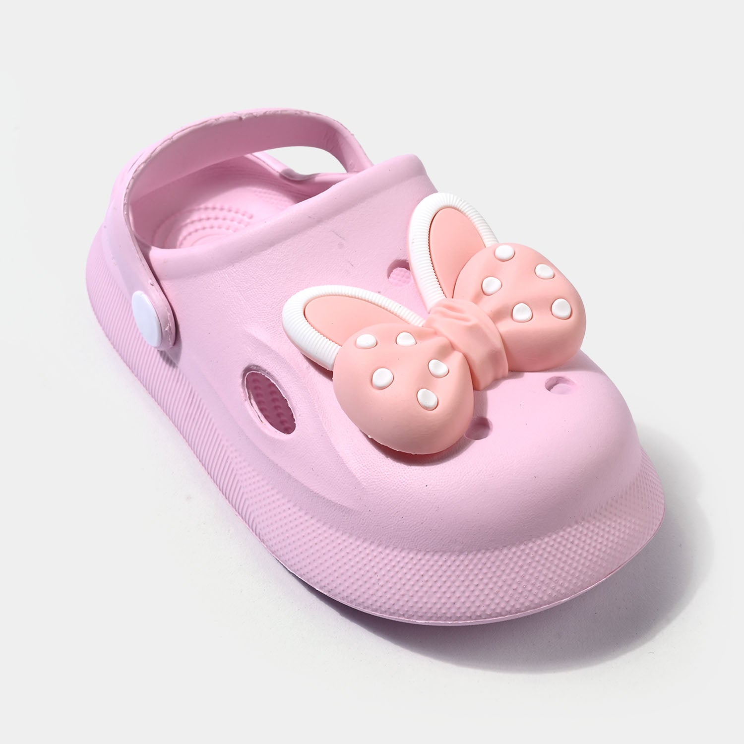 Girls’ pink clogs with Bow embellishments on top and a back strap for a secure, comfortable fit.