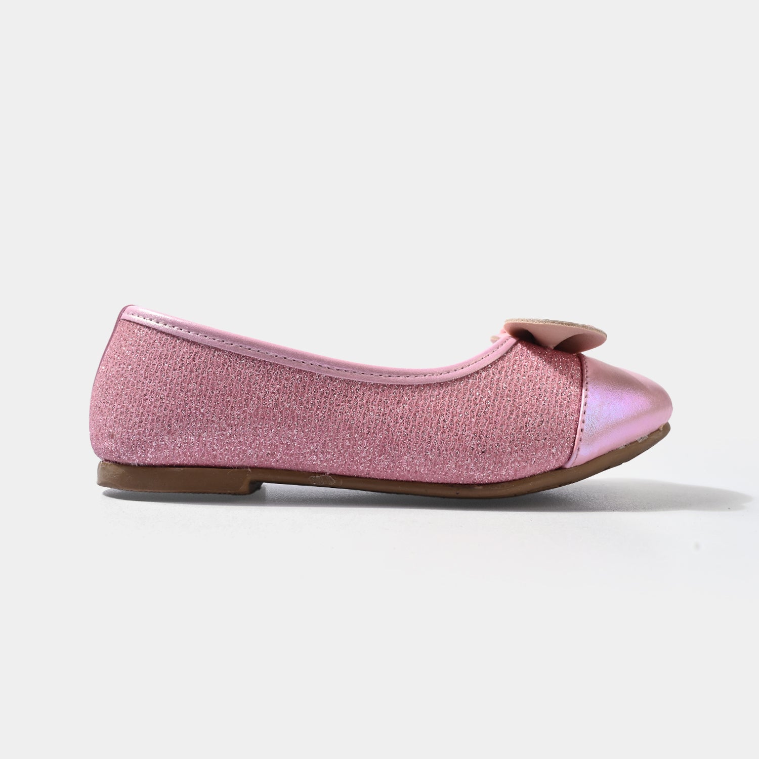 Girls’ pink pumps feature a shiny, glittery finish with a bow embellishment on top, offering a cute look perfect for everyday wear.