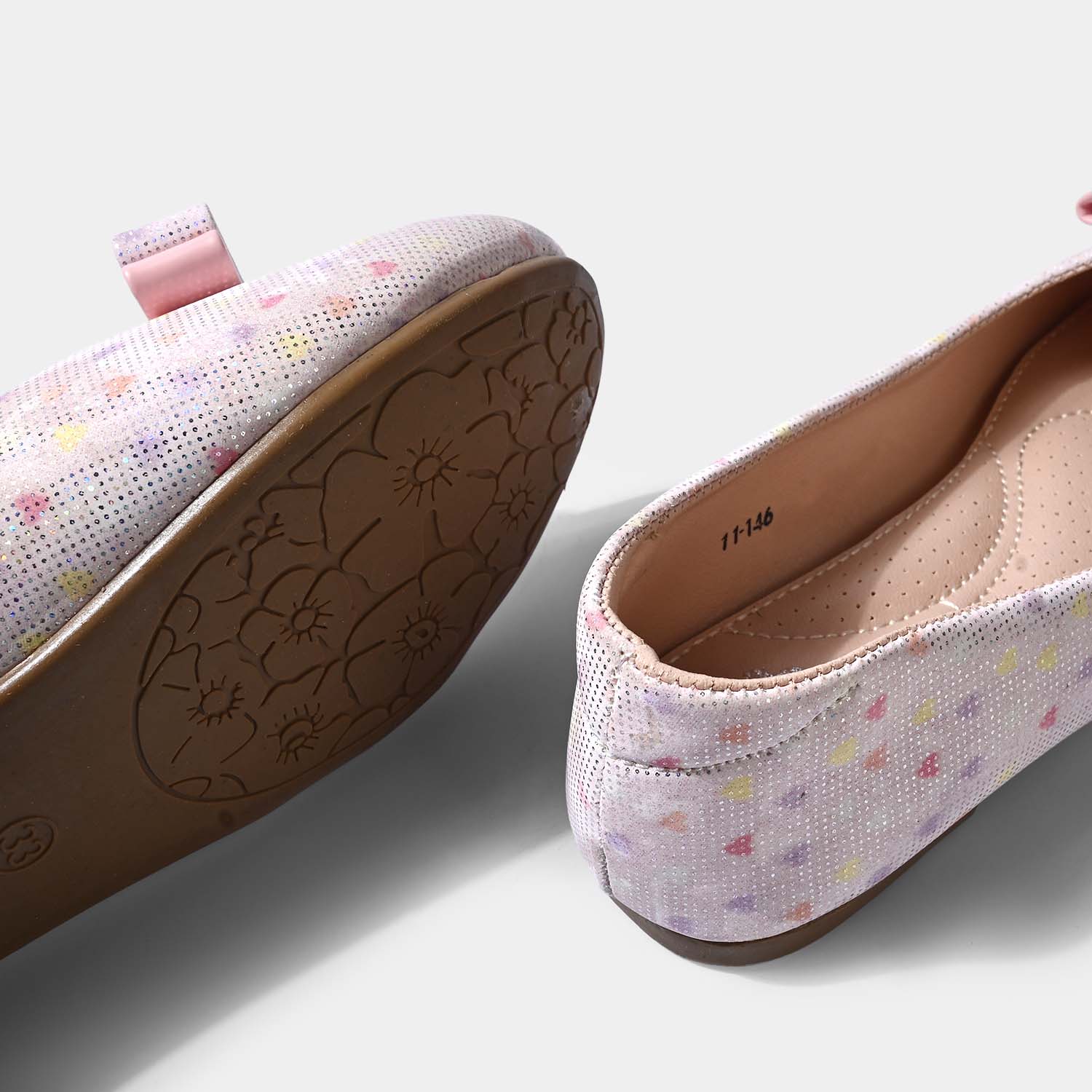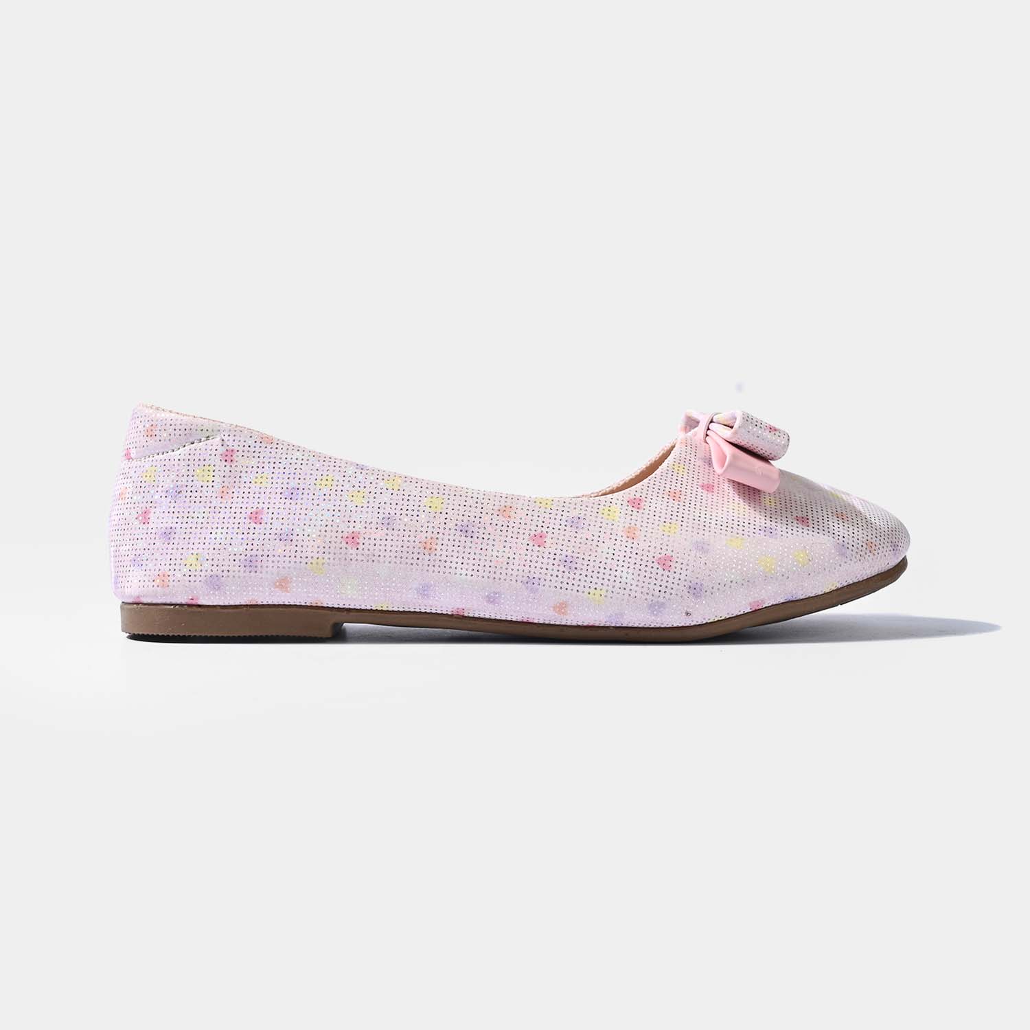 Girls' pink pumps featuring an all-over hearts print and a bow on top, perfect for adding a cute and stylish touch to any outfit.
