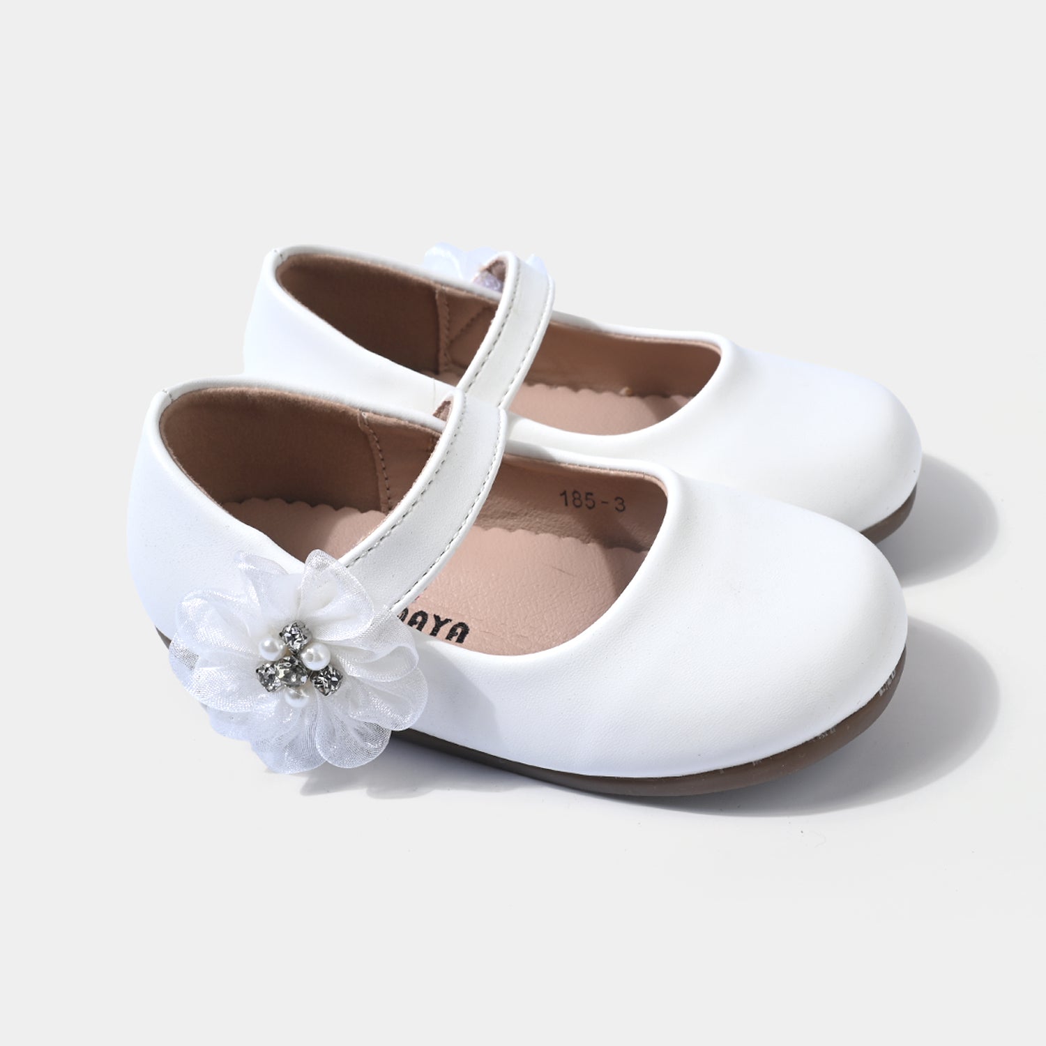 These plain beige girls’ pumps feature a delicate design with a strap and a flower embellishment, perfect for casual everyday wear.