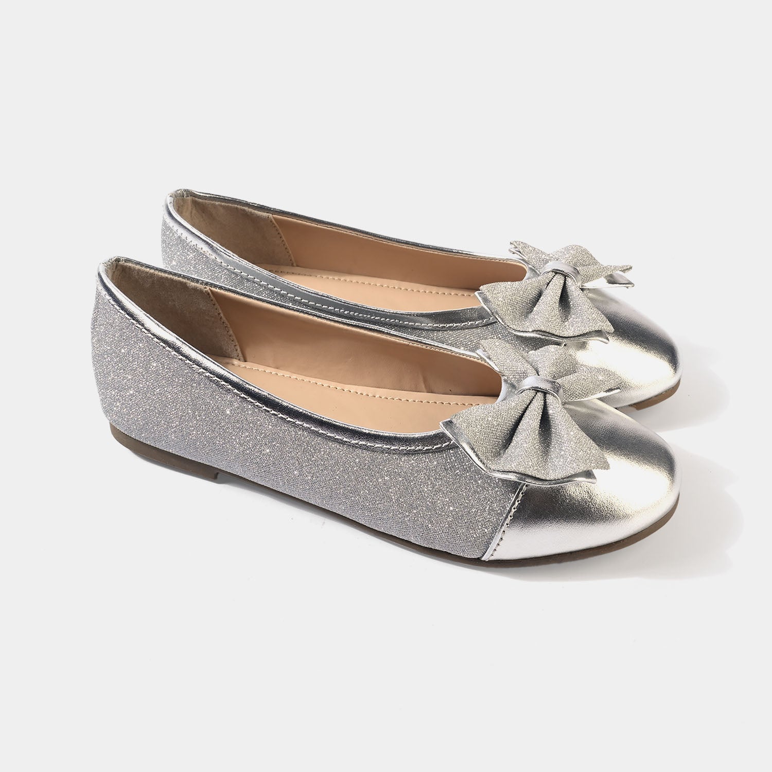 Girls’ sandals in silver featuring a shiny finish and a bow detail, perfect for a stylish and comfortable everyday look.