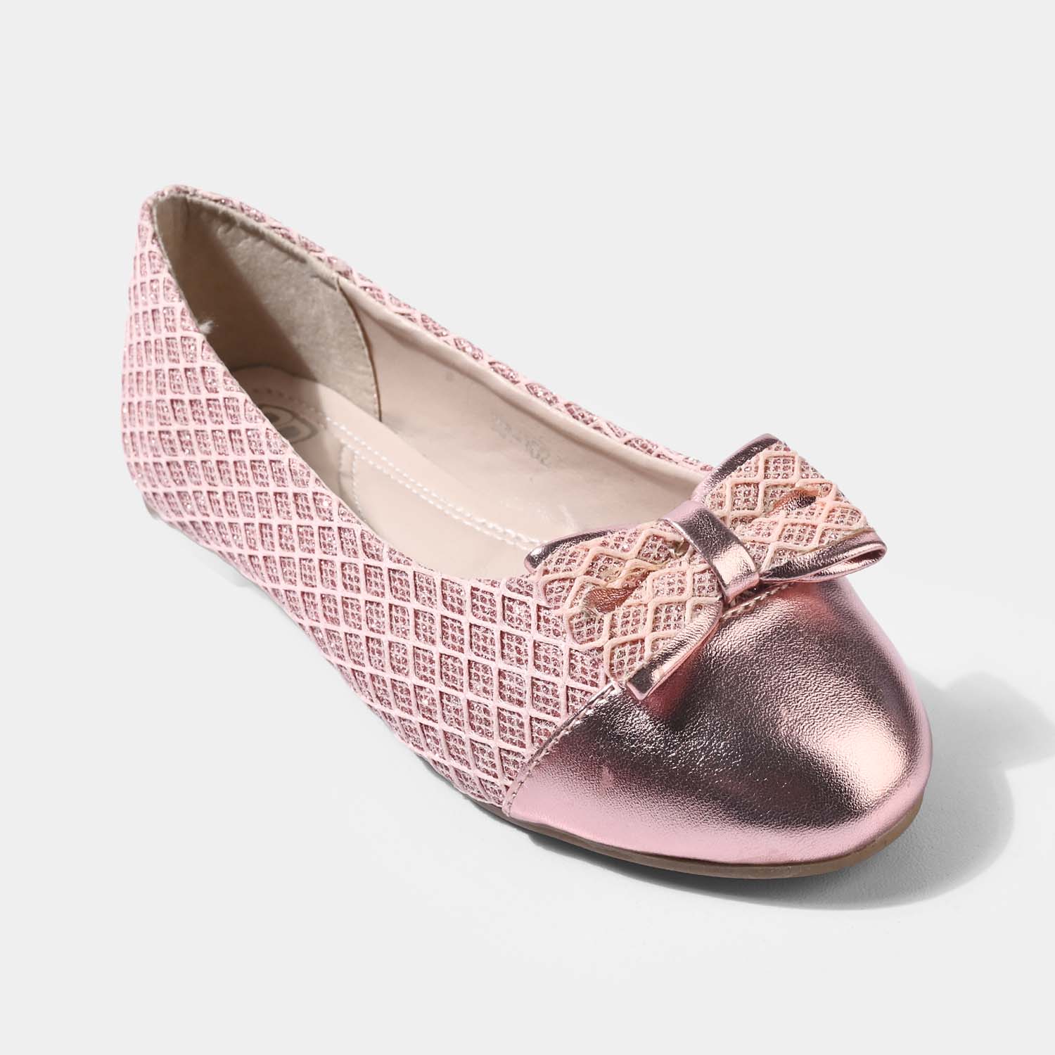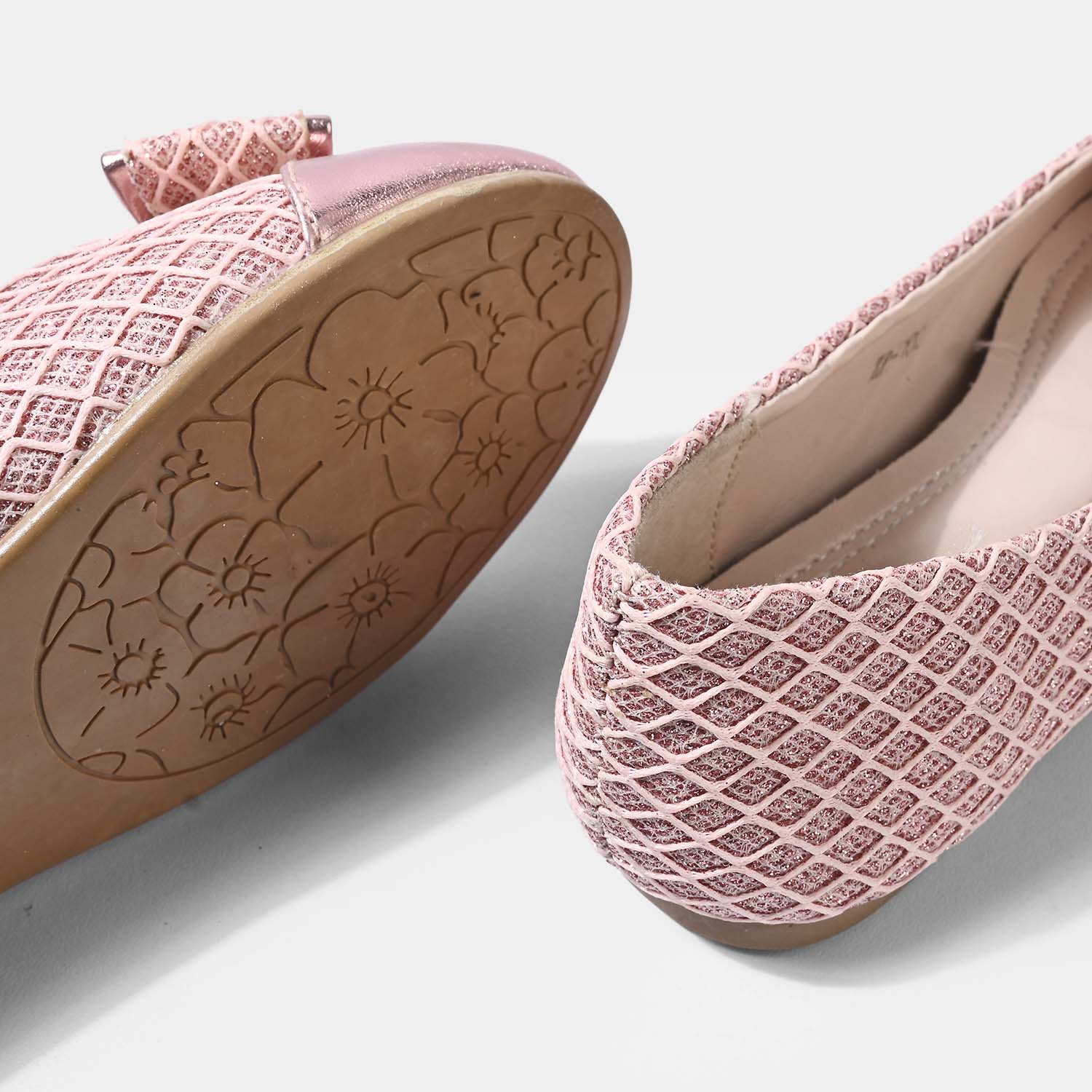 These girls' pumps in champagne feature a textured pattern with a bow embellishment on top, making them perfect for everyday wear.