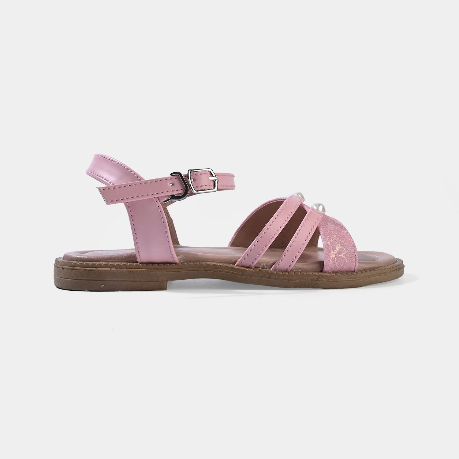 Girls’ sandals in pink featuring an open-toe design, pearl detailing, and an adjustable buckle strap, perfect for a stylish and comfortable everyday look.