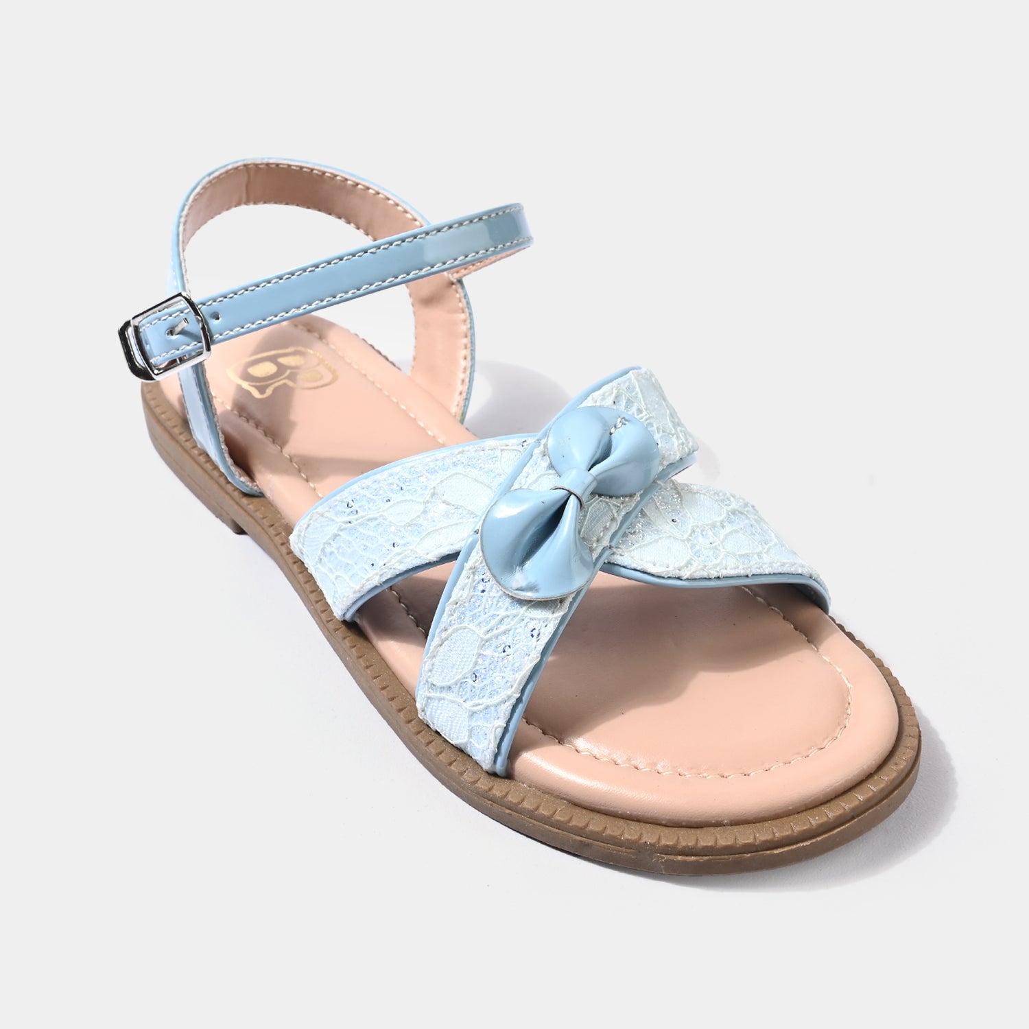 This light blue flat sandal features a delicate lace-textured front strap and bow detail at the center. The adjustable ankle strap with a secure buckle allows easy movement and comfort throughout the day.