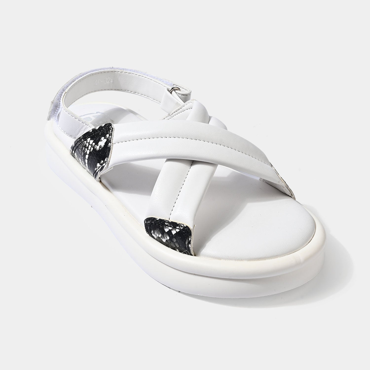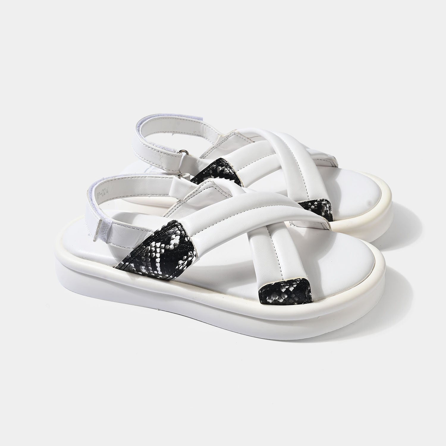 These white sandals feature crisscross straps with black textured accents, providing a stylish and comfortable fit, perfect for casual wear.