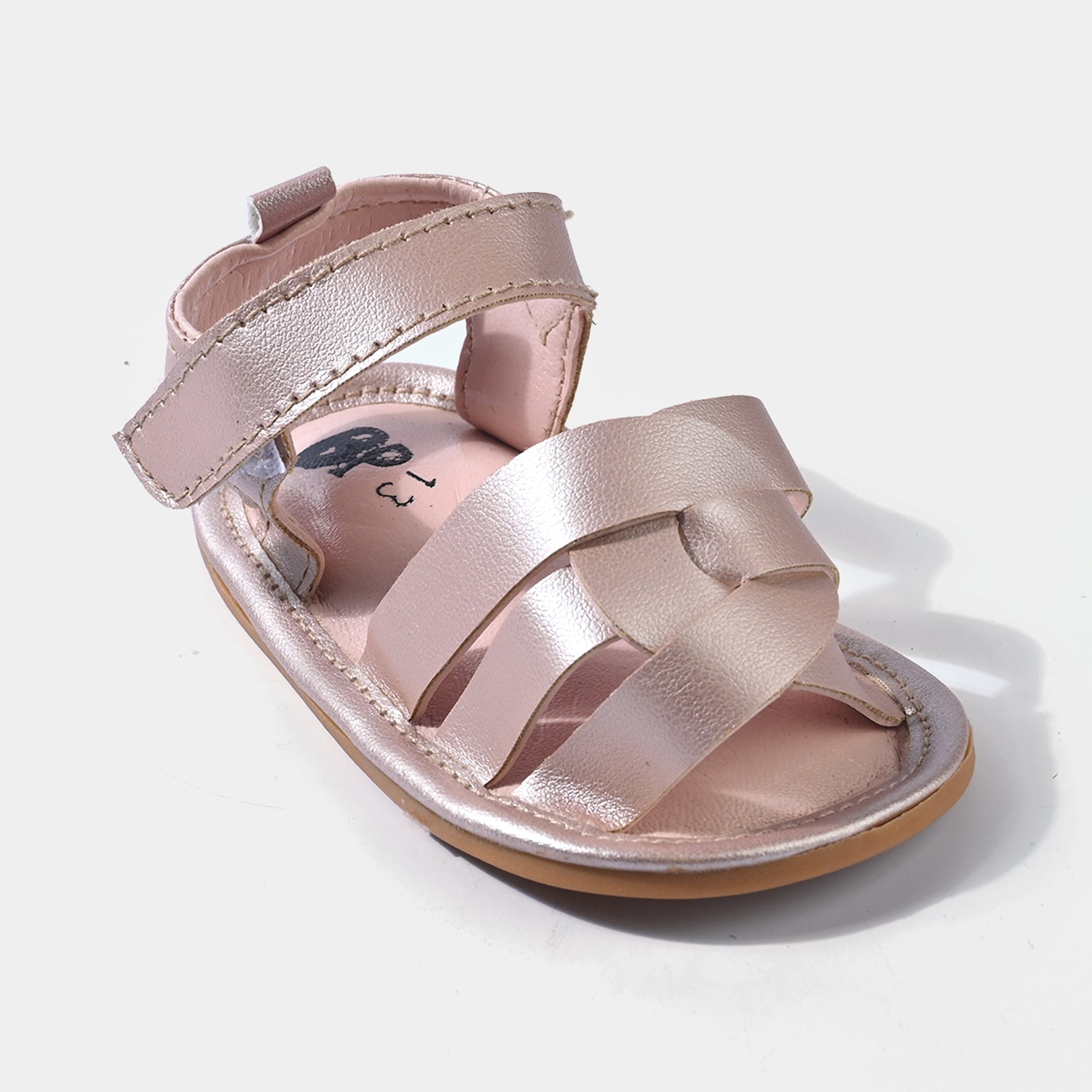 Infant girls’ shoes in pink featuring a shiny finish and strap closure, perfect for adding a smart touch to your little one’s outfit.
