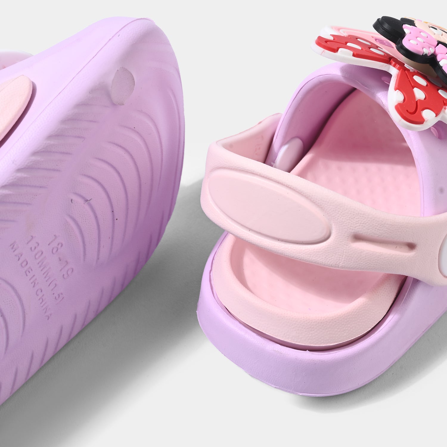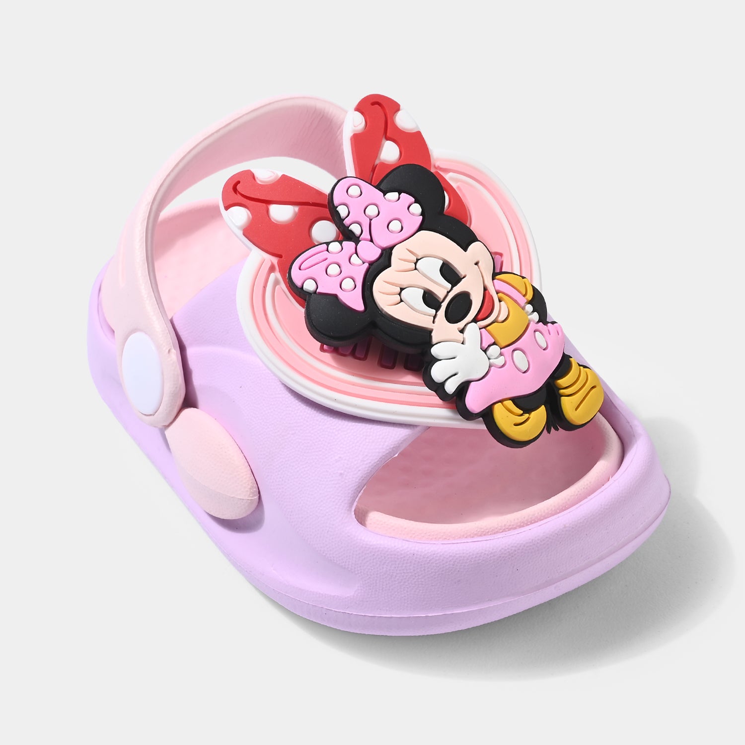 Light purple and pink girls’ slipper with open-toe, adjustable strap, and playful 3D Minnie Mouse.