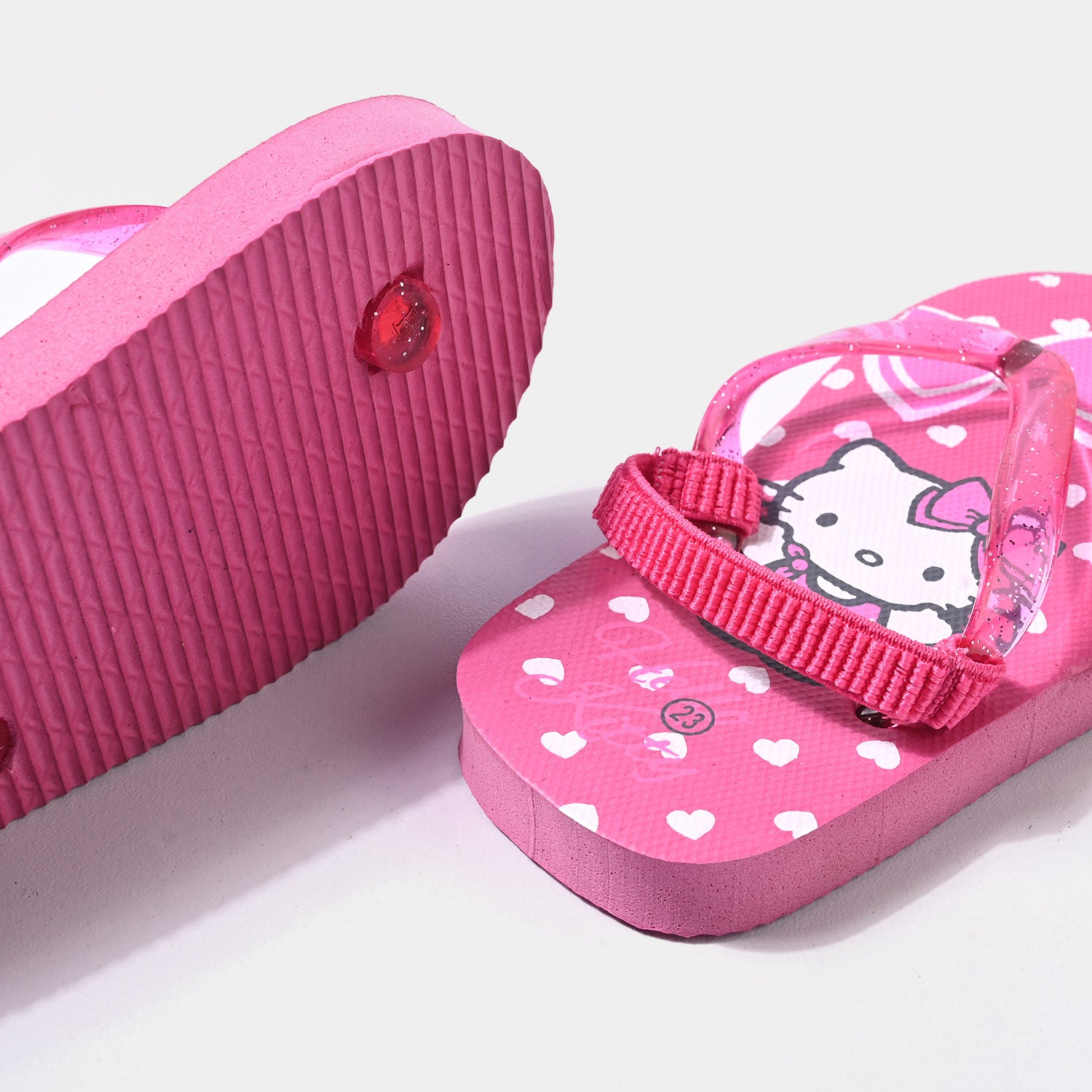 Infant girls fuchsia flipflop features Hello Kitty themed, with a secure back strap to keep your little one comfortable all day long.