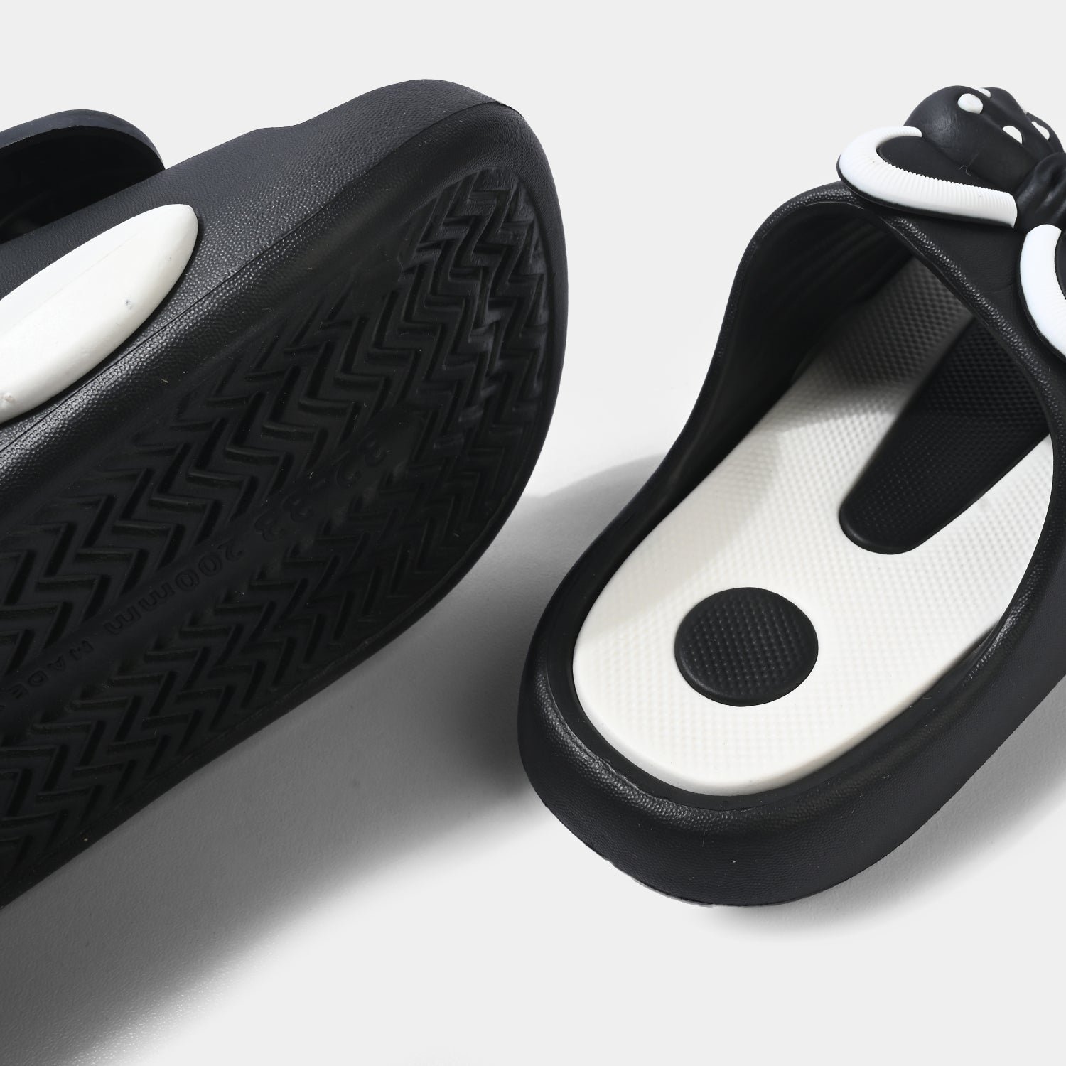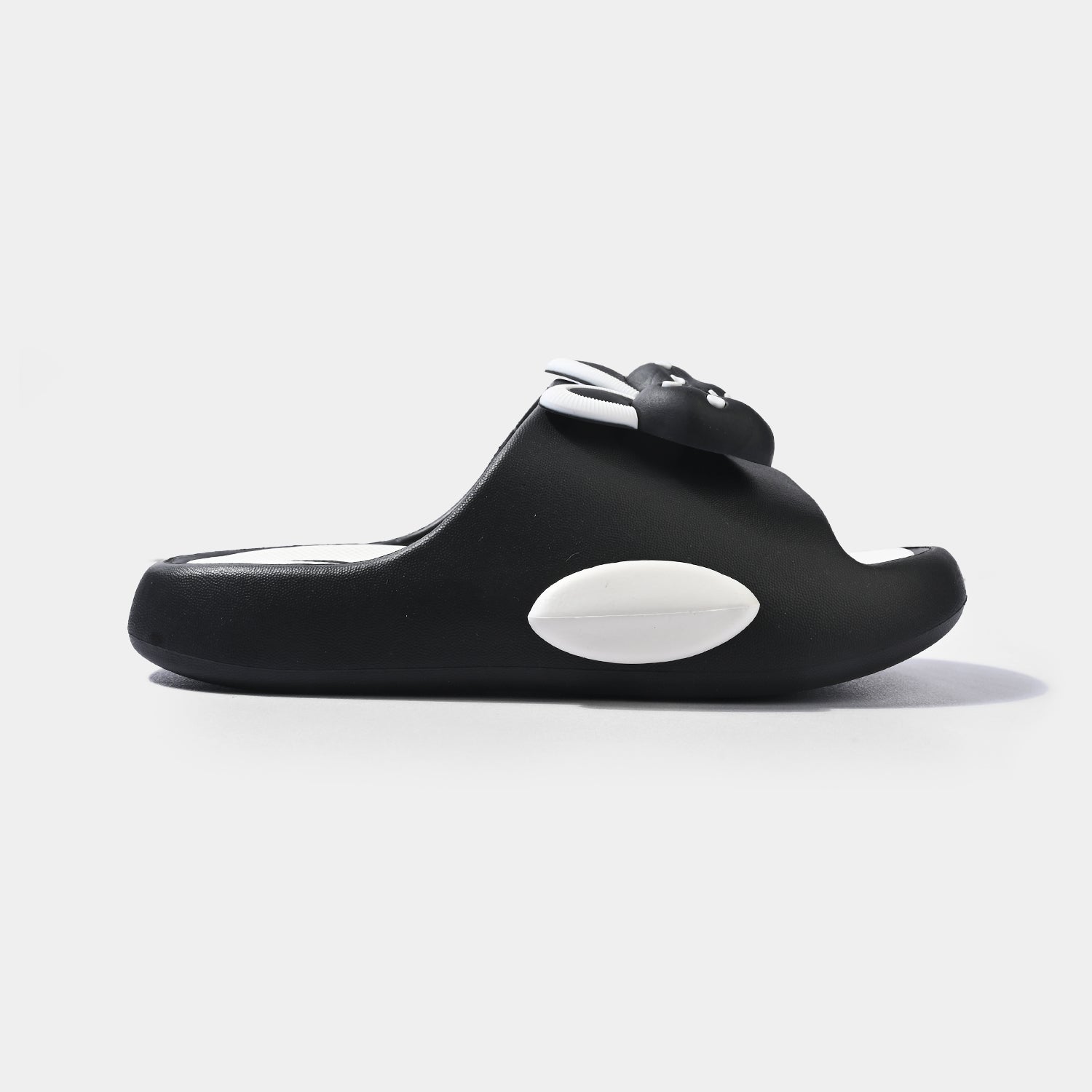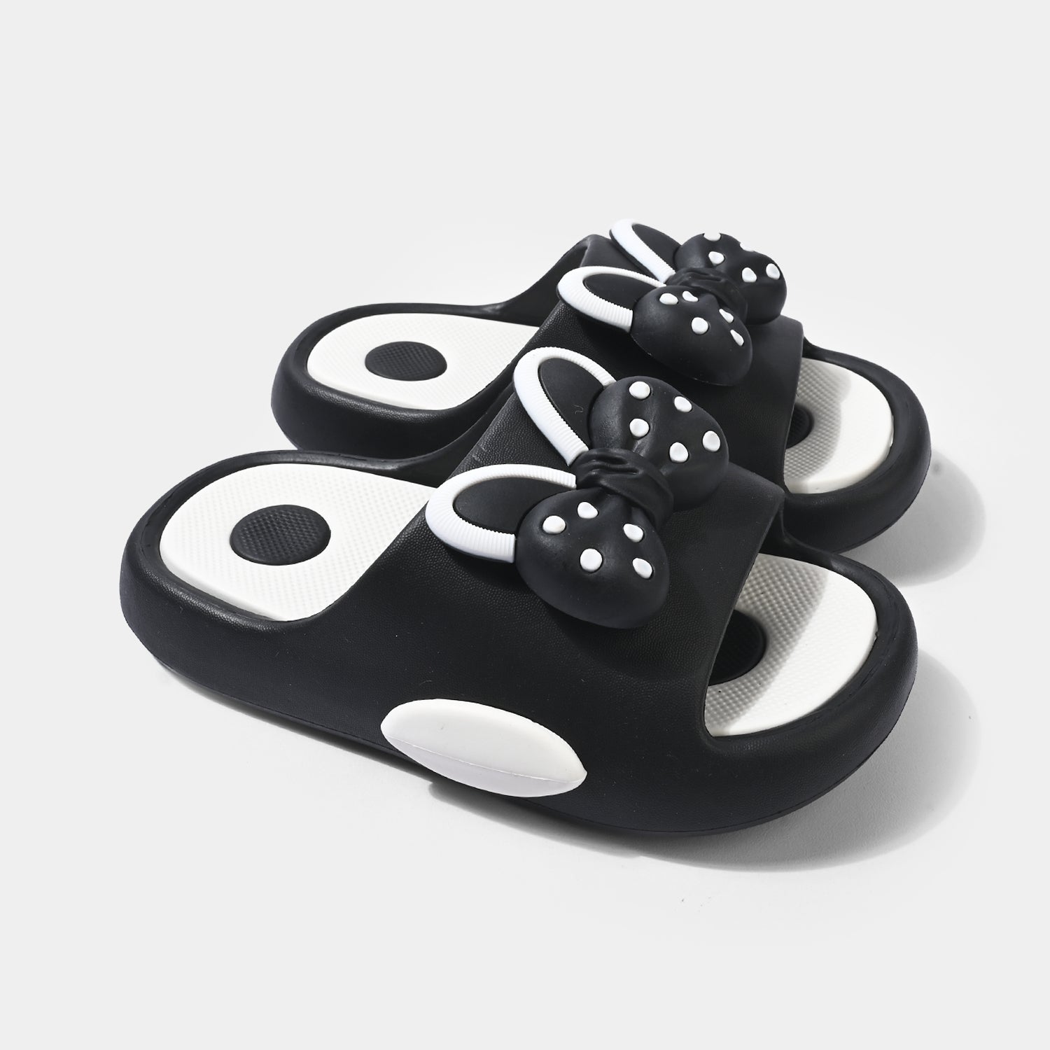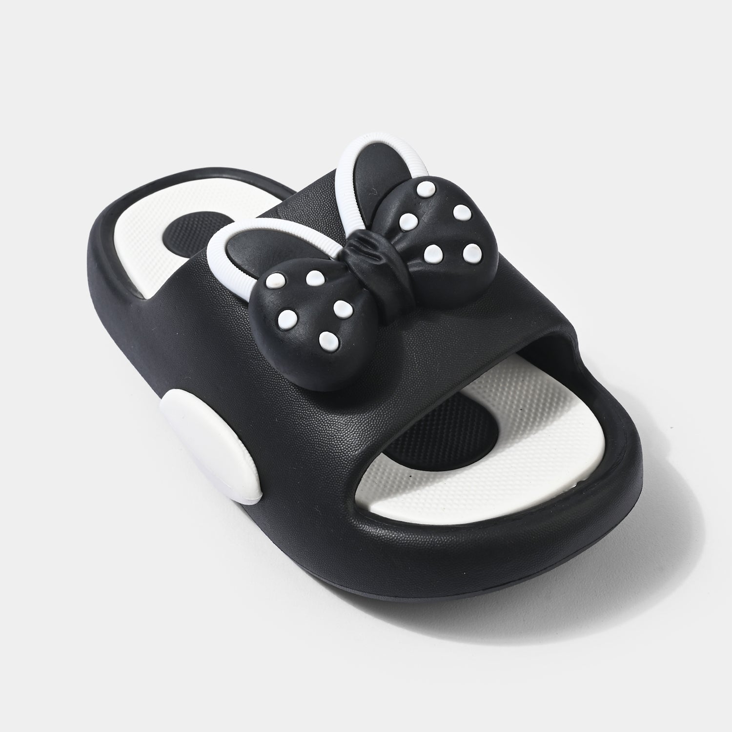 Girls’ black slipper features a charming bow with white polka dots, a soft cushioned sole, and an easy slip-on design. Comfortable and stylish, perfect for everyday wear.