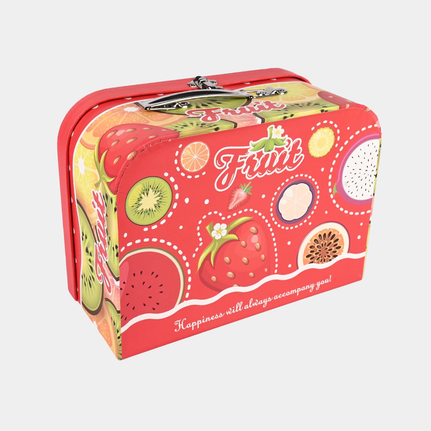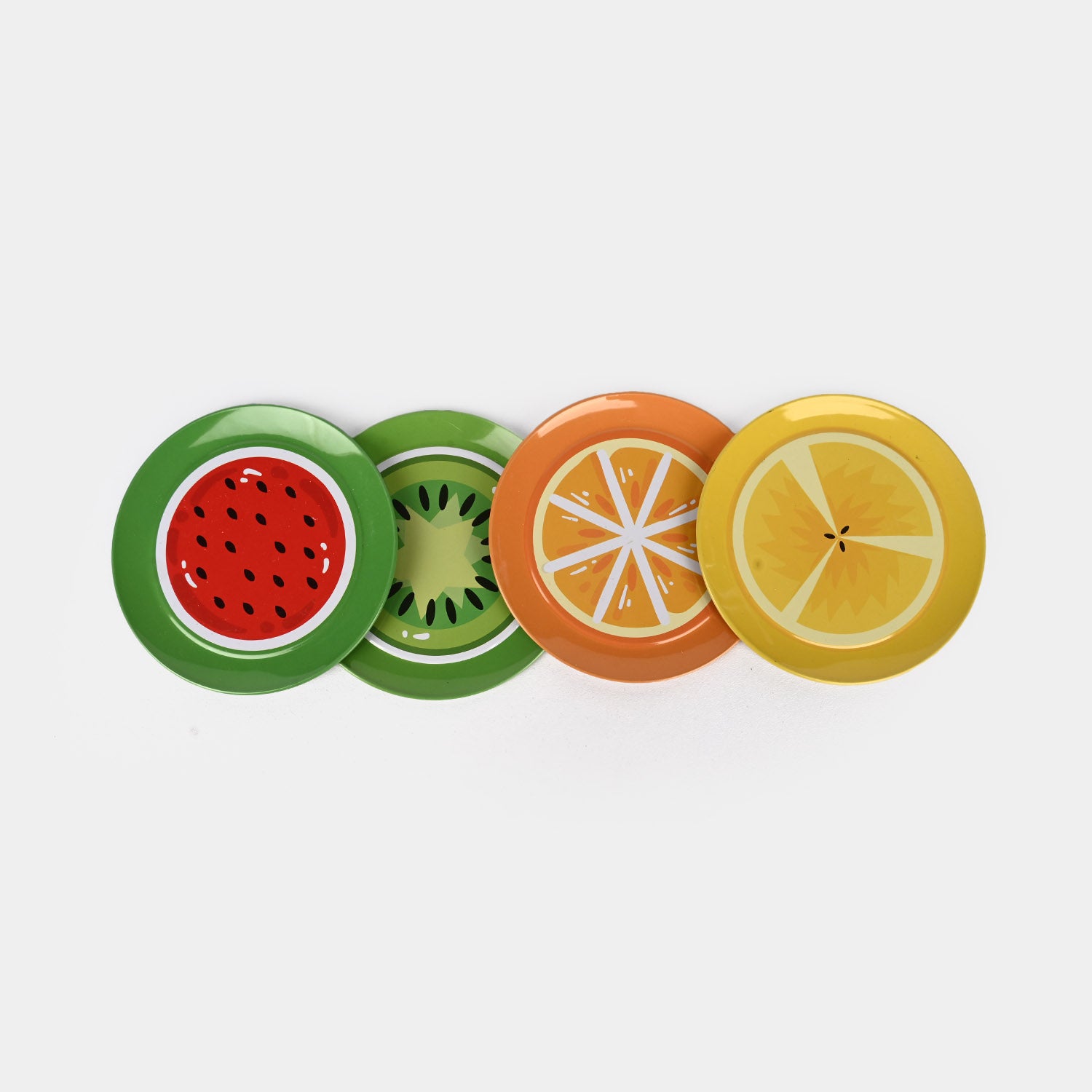 Metal tinplate tea set featuring a fruit-themed 4-person set with 4 cups, 4 saucer plates, and a kettle tray, perfect for imaginative play and developing creativity and social skills.