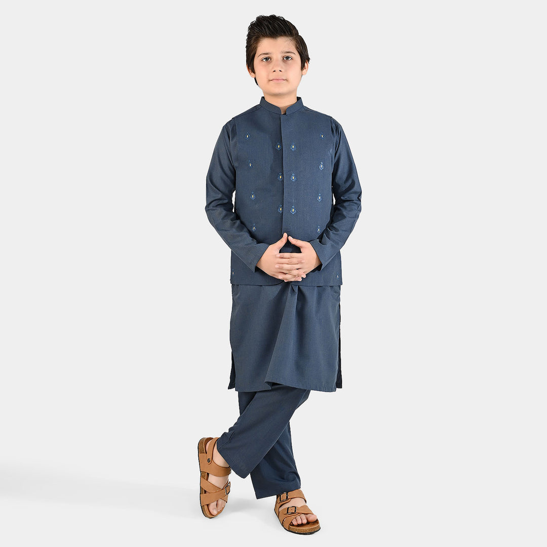 Boys Cotton Kurta pajama Suit (Floral EMB)-T.Blue