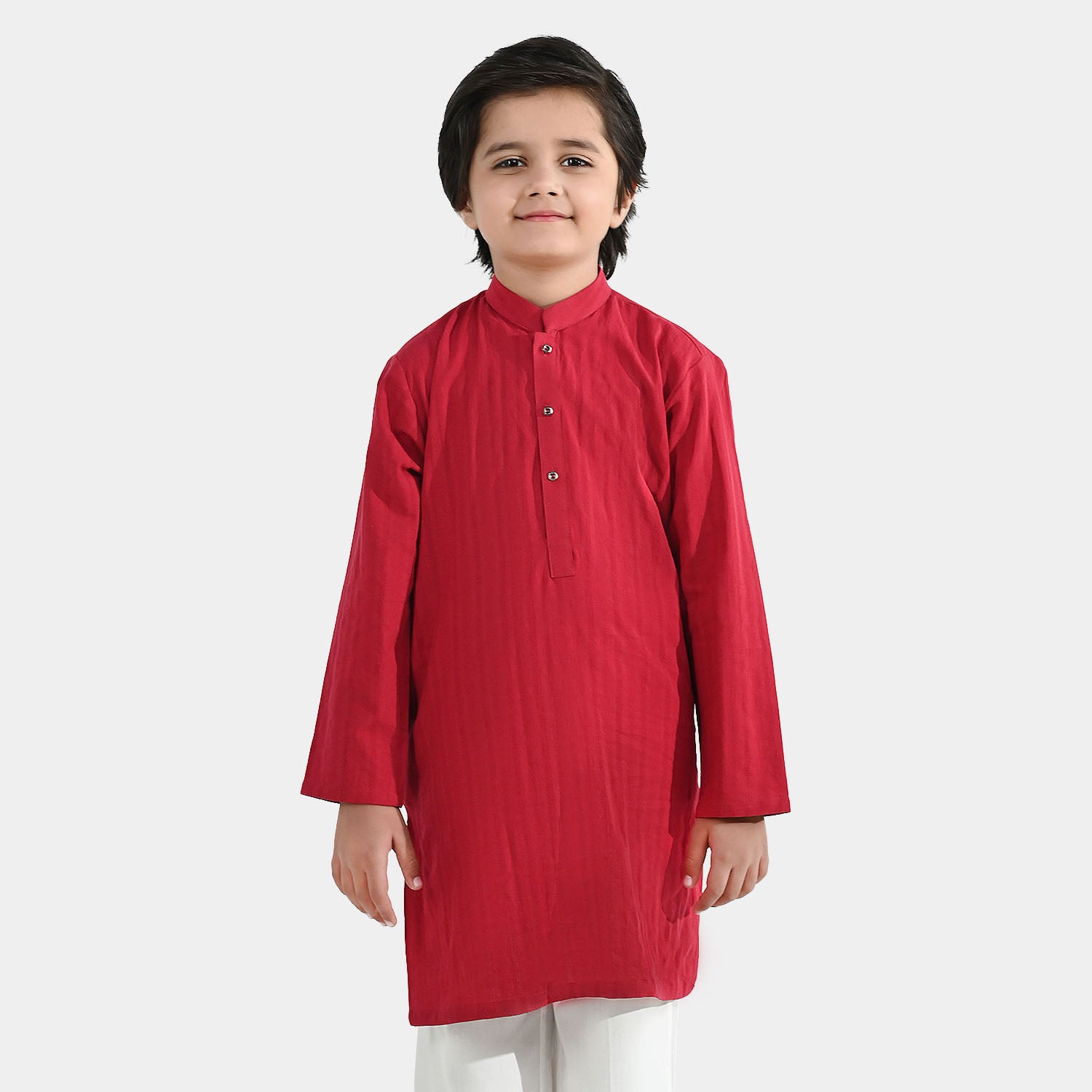 Maroon cotton jacquard kurta for boys featuring full sleeves and a sherwani collar for a comfortable and stylish look.