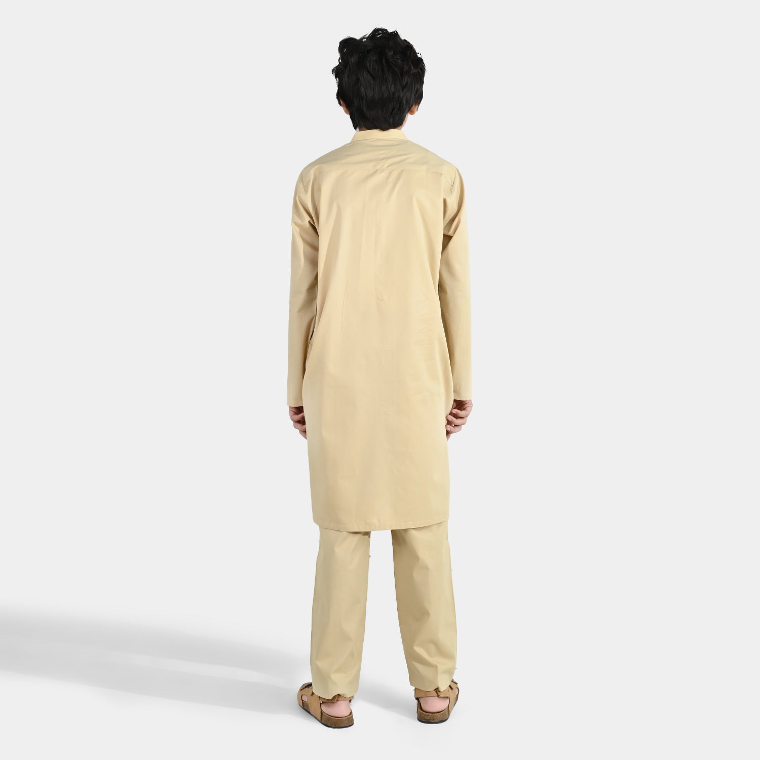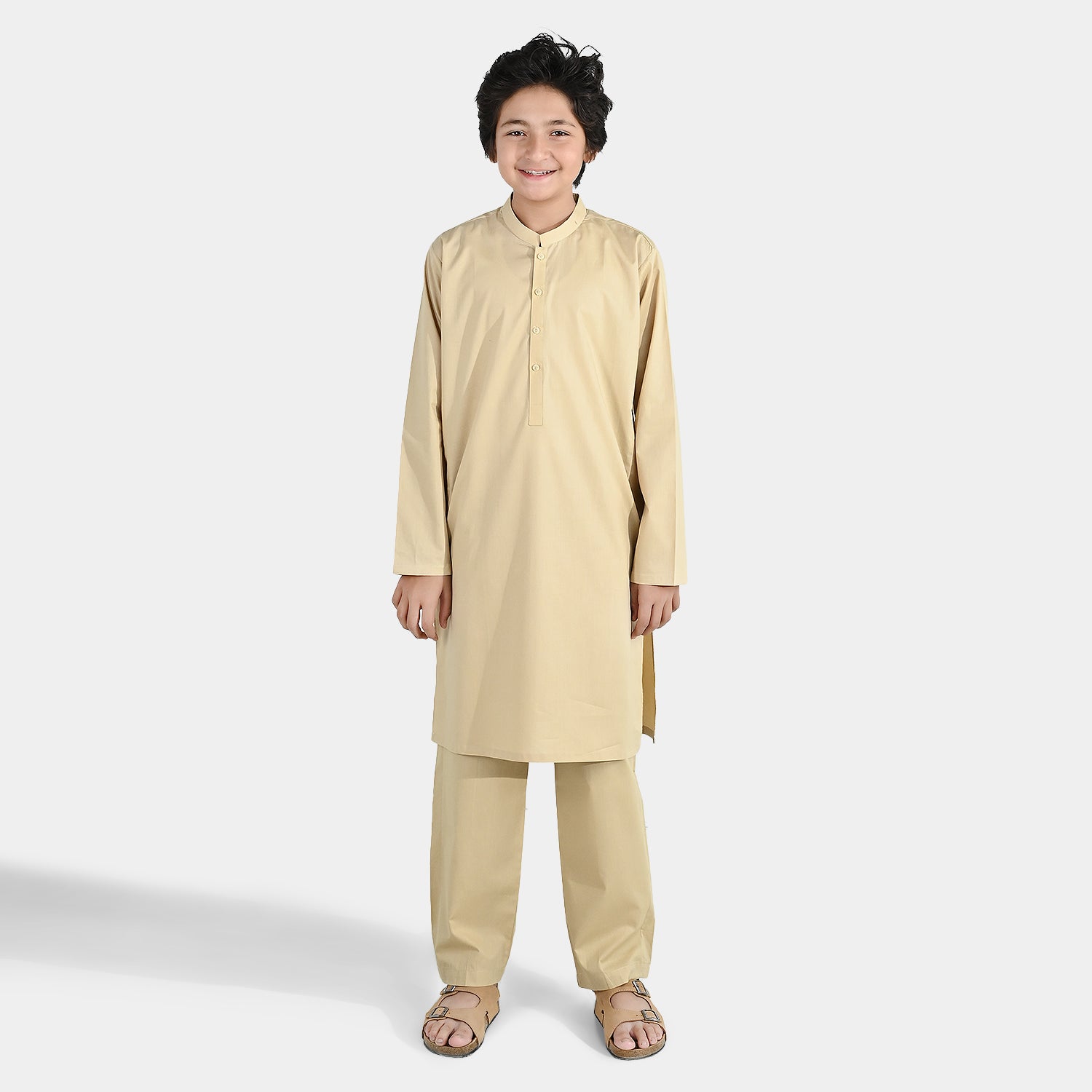 Boys beige cotton poplin kurta pajama featuring a sherwani collar and full sleeves, ideal for a classic and comfortable traditional look.