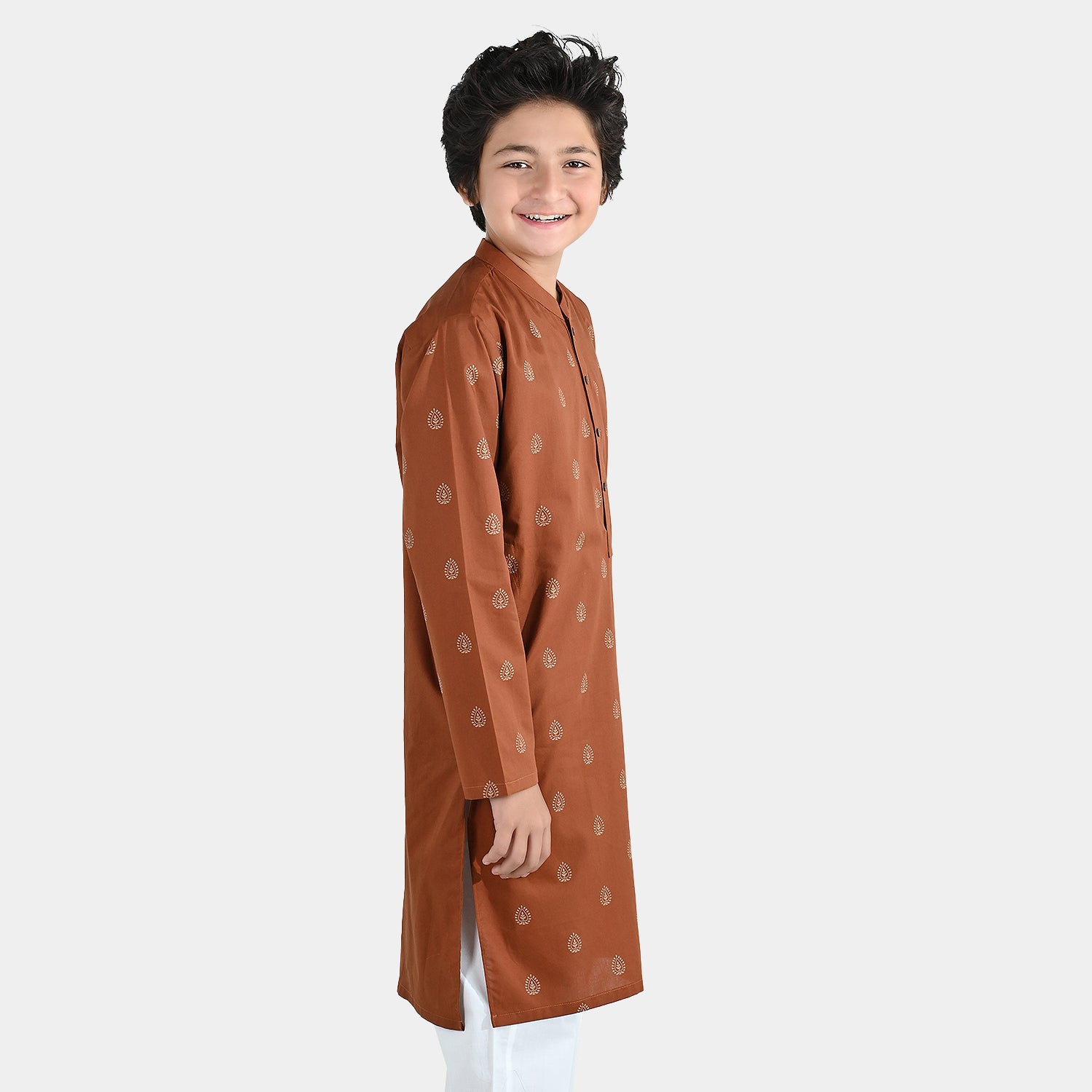 Boys brown cotton poplin printed kurta featuring a sherwani collar and full sleeves, perfect for a classic and comfortable traditional look.