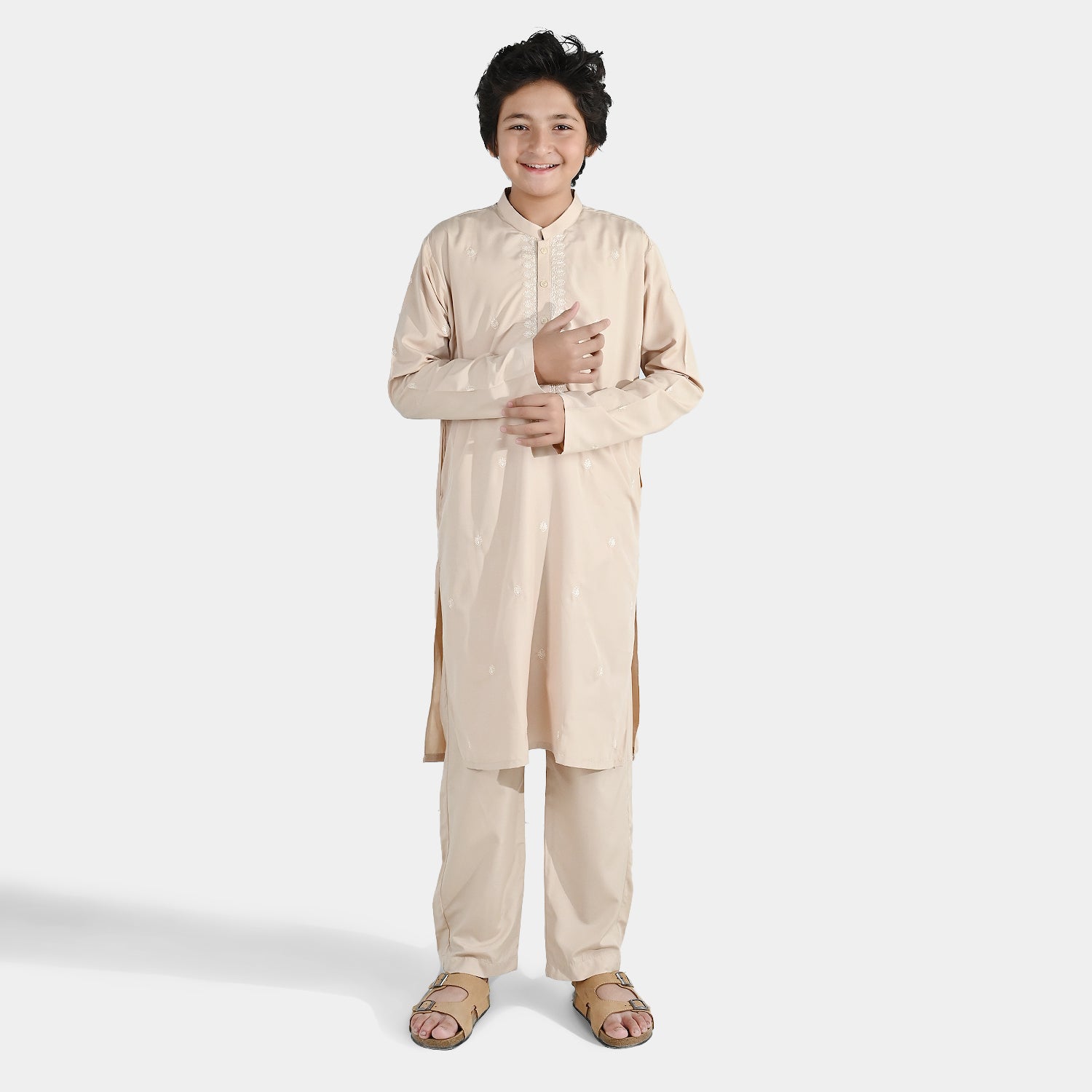 This boys beige kurta pajama features an embroidered sherwani collar, full sleeves, and matching trousers for a traditional, festive look.