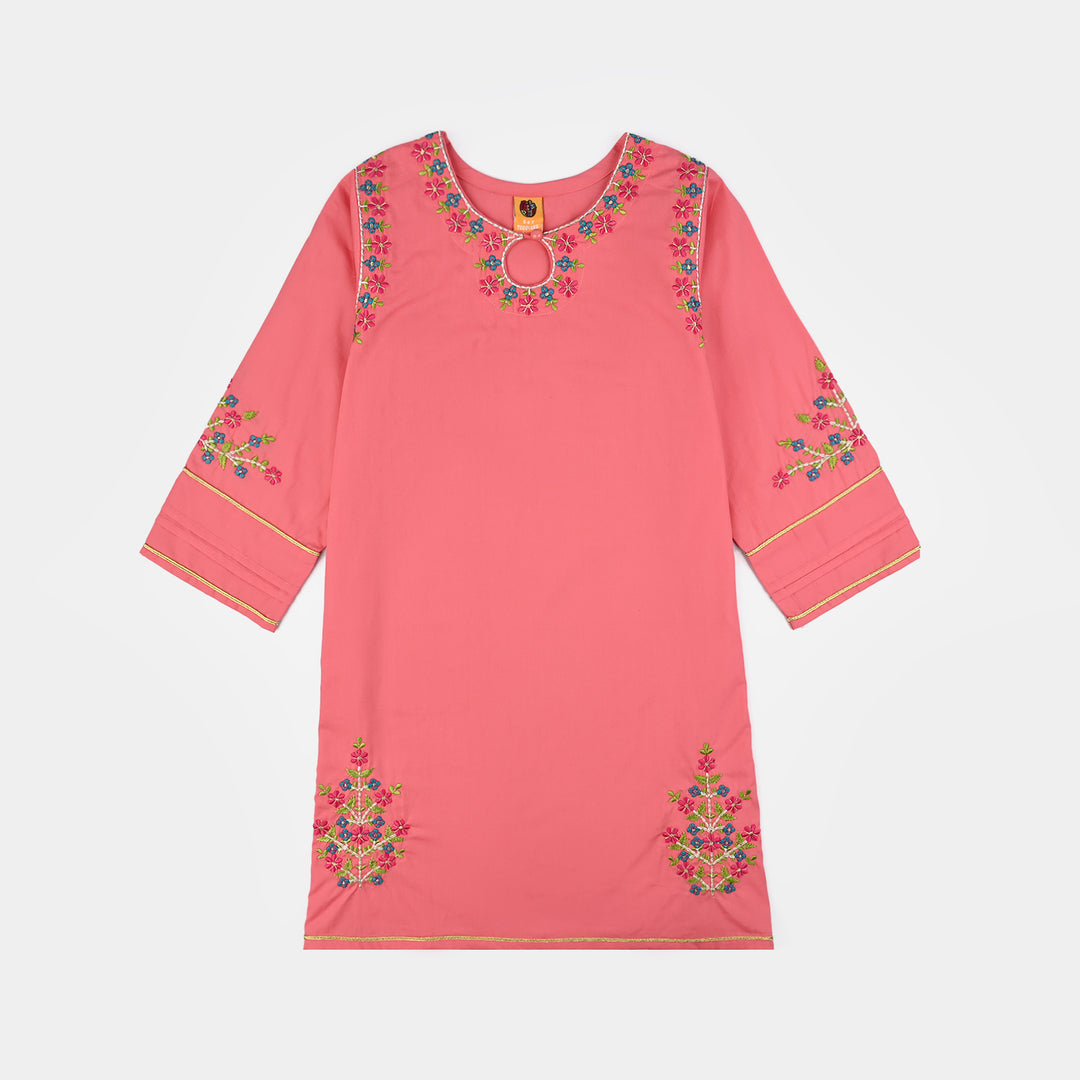 Girls Cotton Slub EMB Long Kurti Gul Rang-Pink