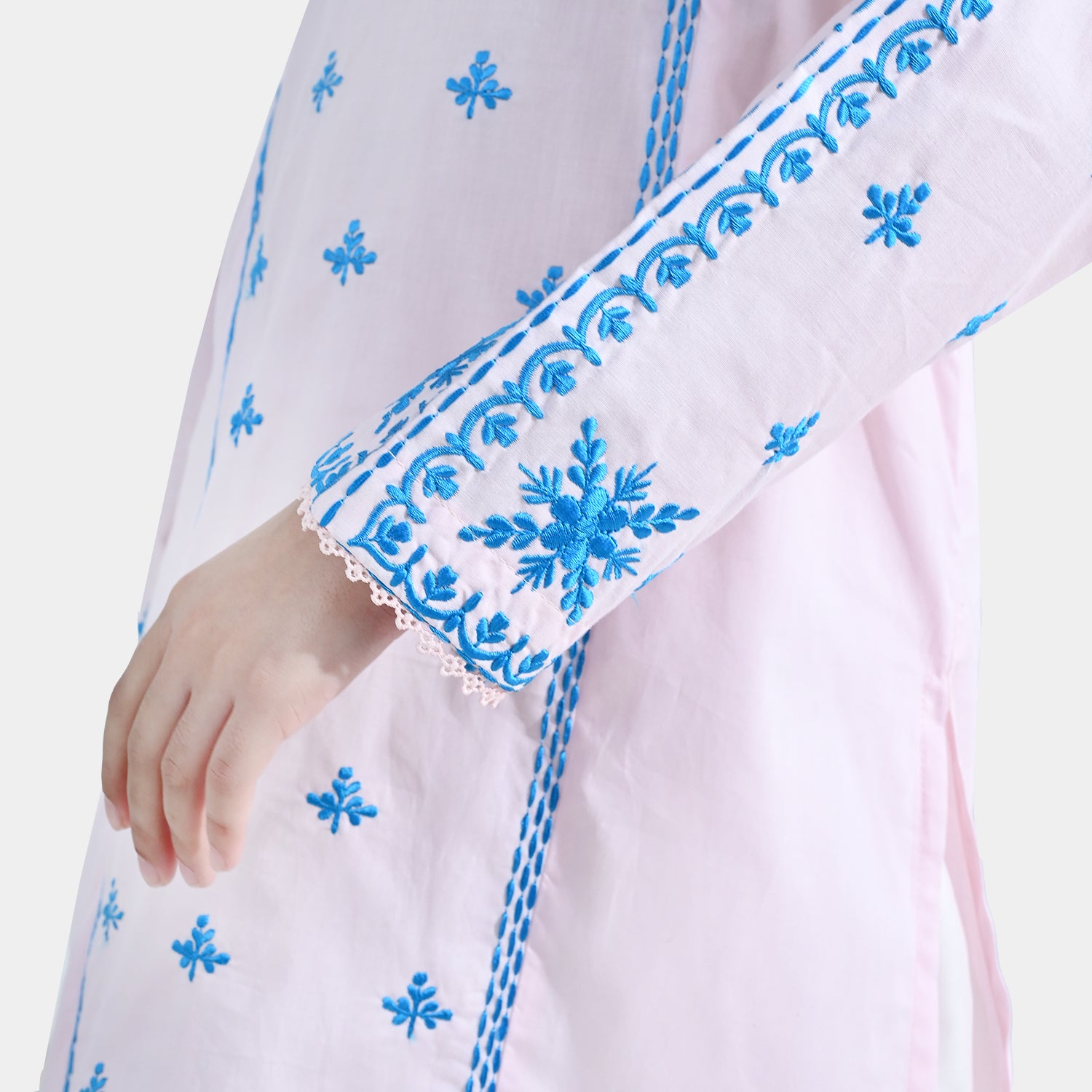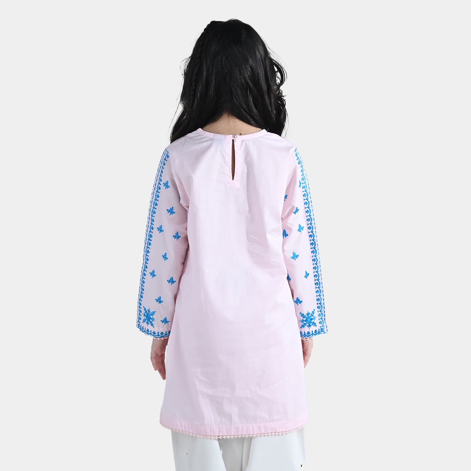 Girls’ cotton embroidered kurti Roshan Jahan in baby pink, featuring a round neck, full sleeves, lace detailing, and contrast blue embroidery.