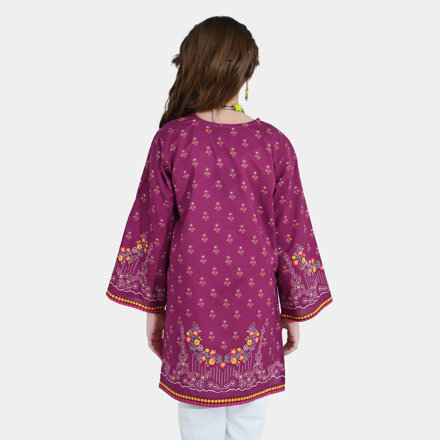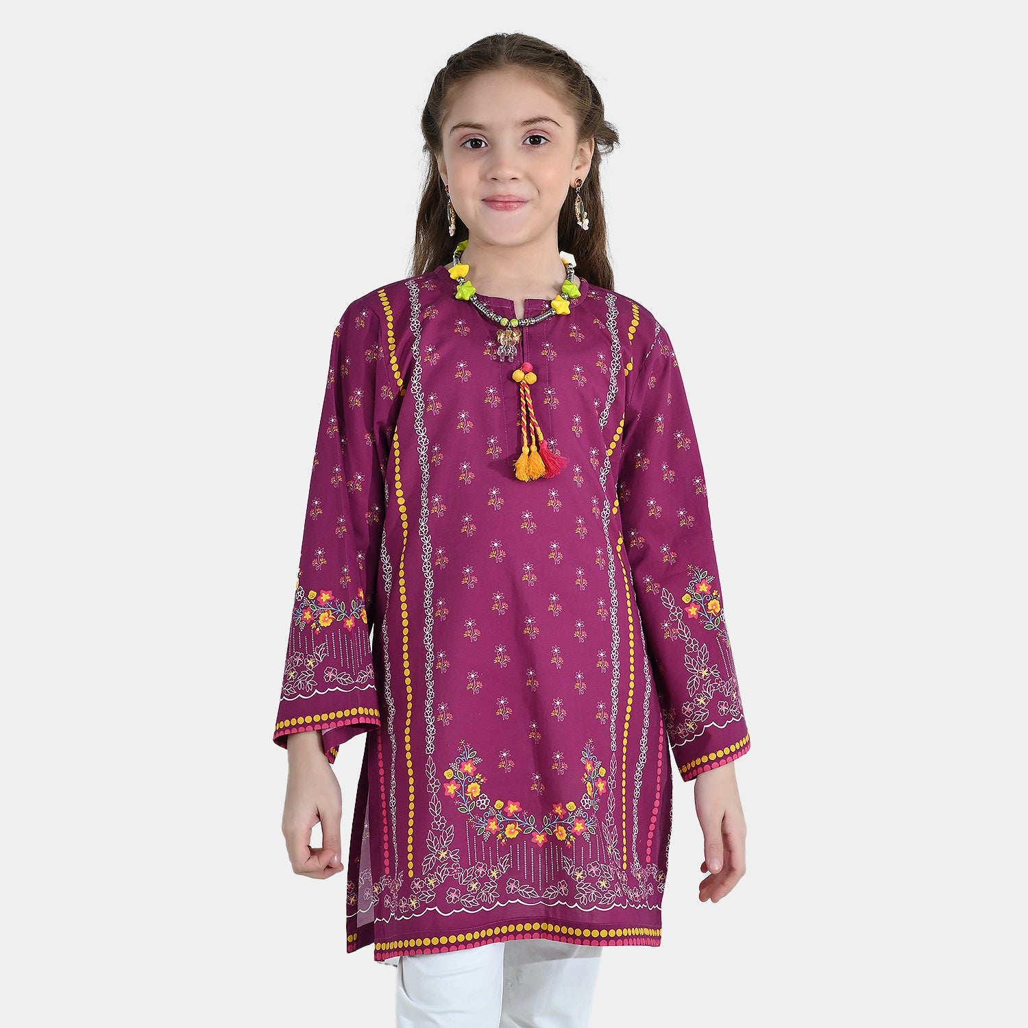 Girls’ plum-purple cotton poplin printed kurti with a straight fit, full sleeves, and tassel detailing on the neckline, perfect to pair with jeans, tights, or any bottoms.